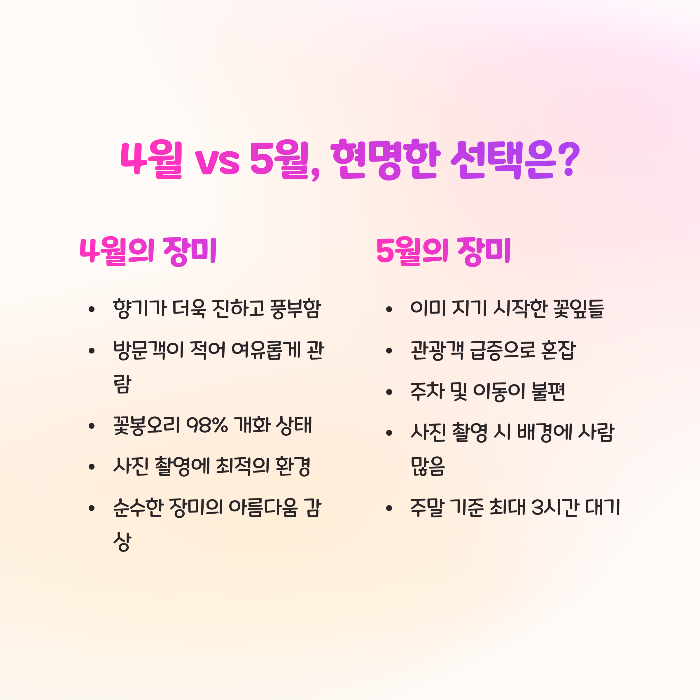 - 개화 절정: 4월 셋째 주부터! 5월엔 이미 늦어요
