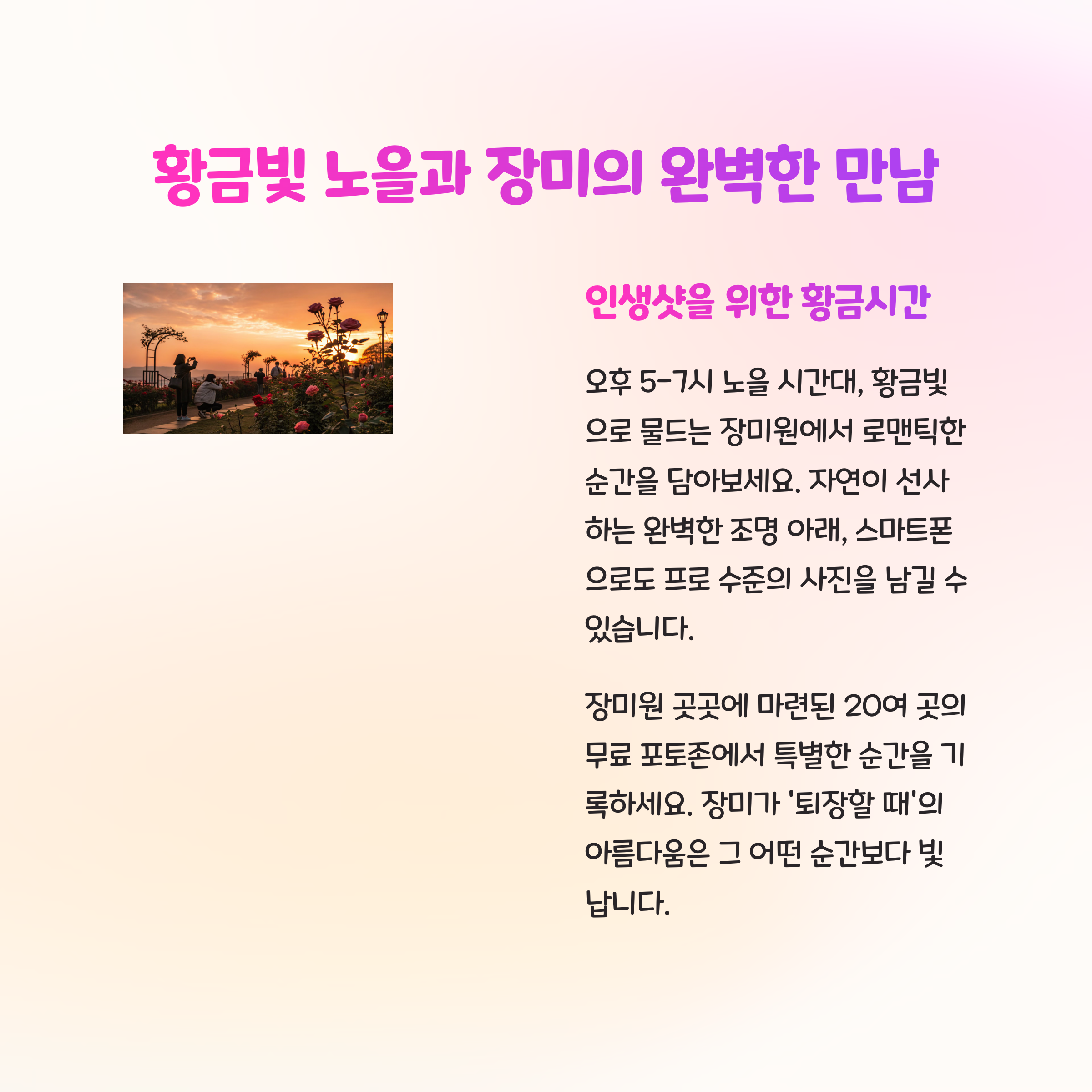 📸 꽃이 만개한 이 순간, 당신의 인생샷을 남겨보세요! 거제 장미원, 지금이 바로 그때입니다.