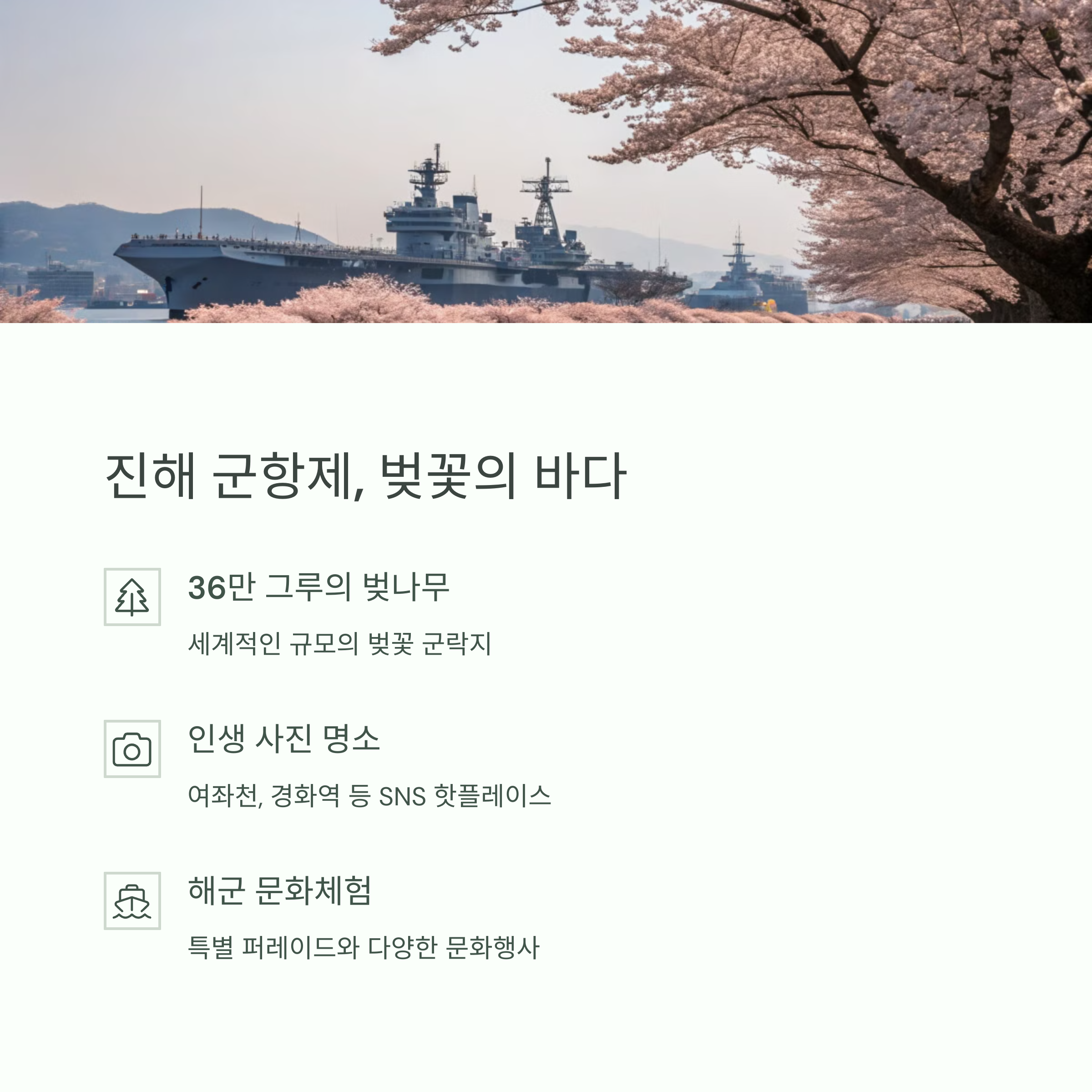 해군사관학교, 여좌천, 중원로터리 등에서 벚꽃이 만개하며, 군악대 퍼레이드와 함께 봄의 축제 분위기를 만끽할 수 있어요.🚀