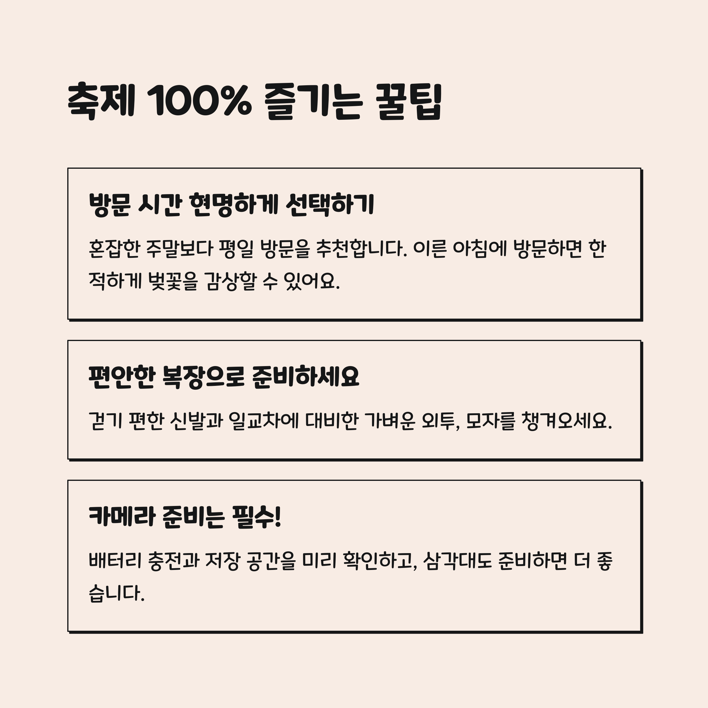 ✔️행사장 인근은 주차 공간이 제한적입니다. 축제 기간 동안은 일부 도로가 통제될 수 있으므로 대중교통 이용을 적극 권장합니다.