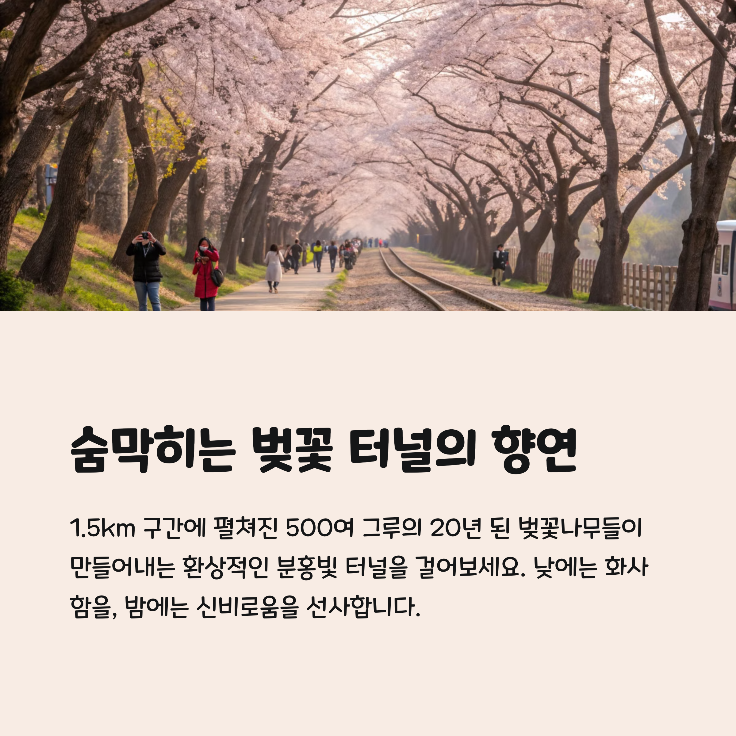벚꽃길을 따라 걷다 보면 어느새 마음도 환해지고 함께 걷는 사람과의 추억도 깊어지죠.