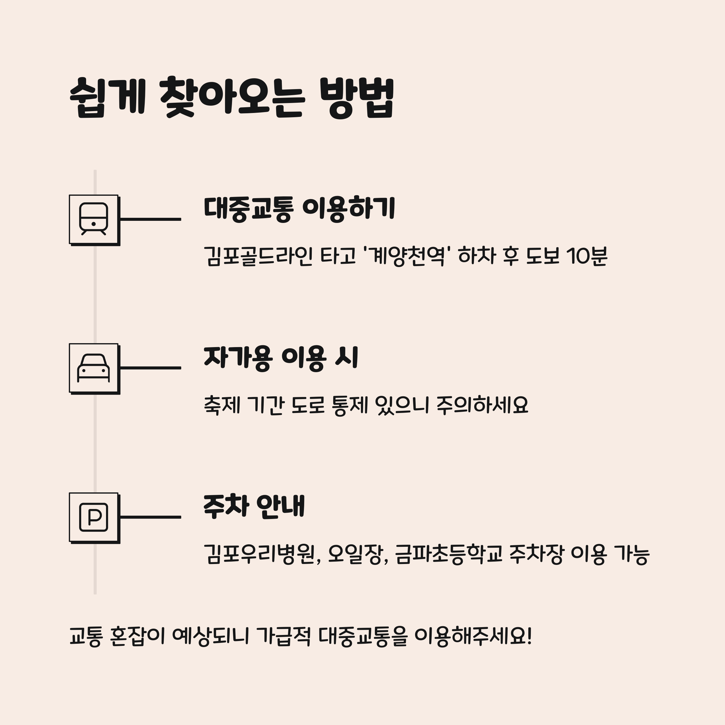 ✔️지하철 9호선 김포공항역에서 버스 환승이 가능하며, 지정 주차장을 운영할 예정이니 미리 확인하고 이동하시면 편리해요.