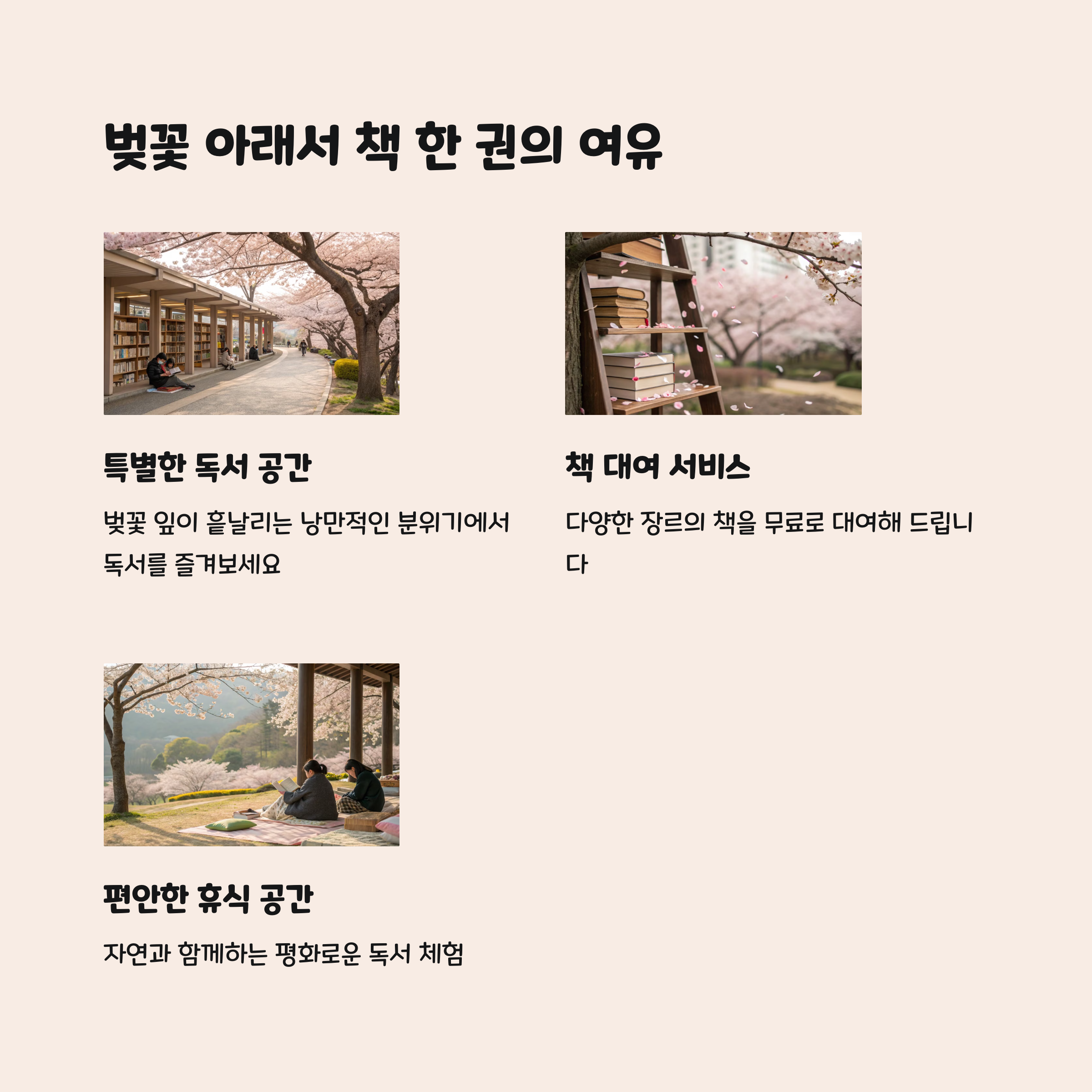 이번 축제에는 버스킹 공연, 벚꽃 도서관, 플리마켓 등 다양하고 감성적인 프로그램이 준비되어 있습니다.