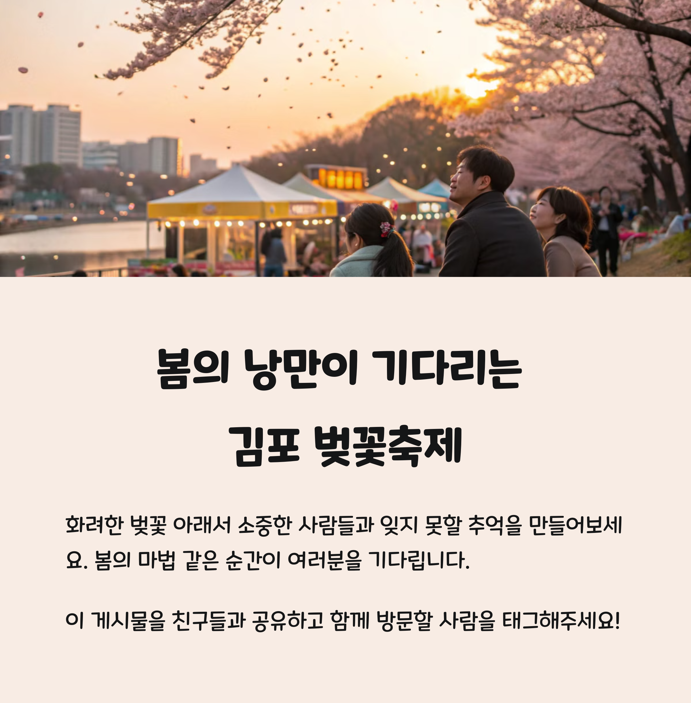 | 2025년 4월 5일 ~ 6일 | 김포 계양천 산책로 일원 | 버스킹, 플리마켓, 포토존, 벚꽃 도서관 |