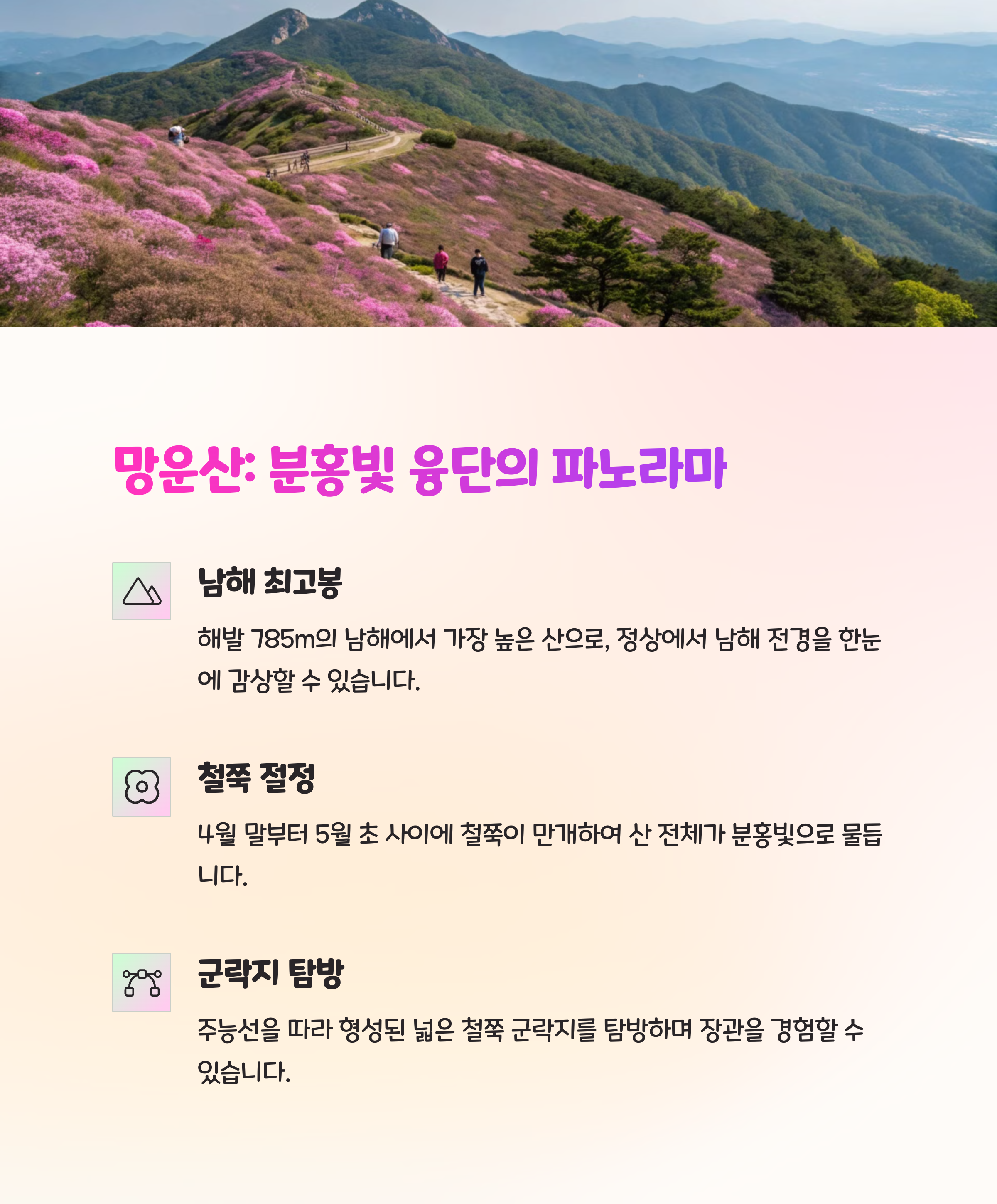 망운산은 남해에서 가장 높은 산으로, 화방사에서 정상까지 1시간 30분이면 오를 수 있어 가볍게 트레킹하며 꽃구경하기에 딱 좋습니다. 금산은 보리암이 있는 명소로, 일출과 함께 철쭉을 감상하는 명장면이 탄생하는 곳입니다.