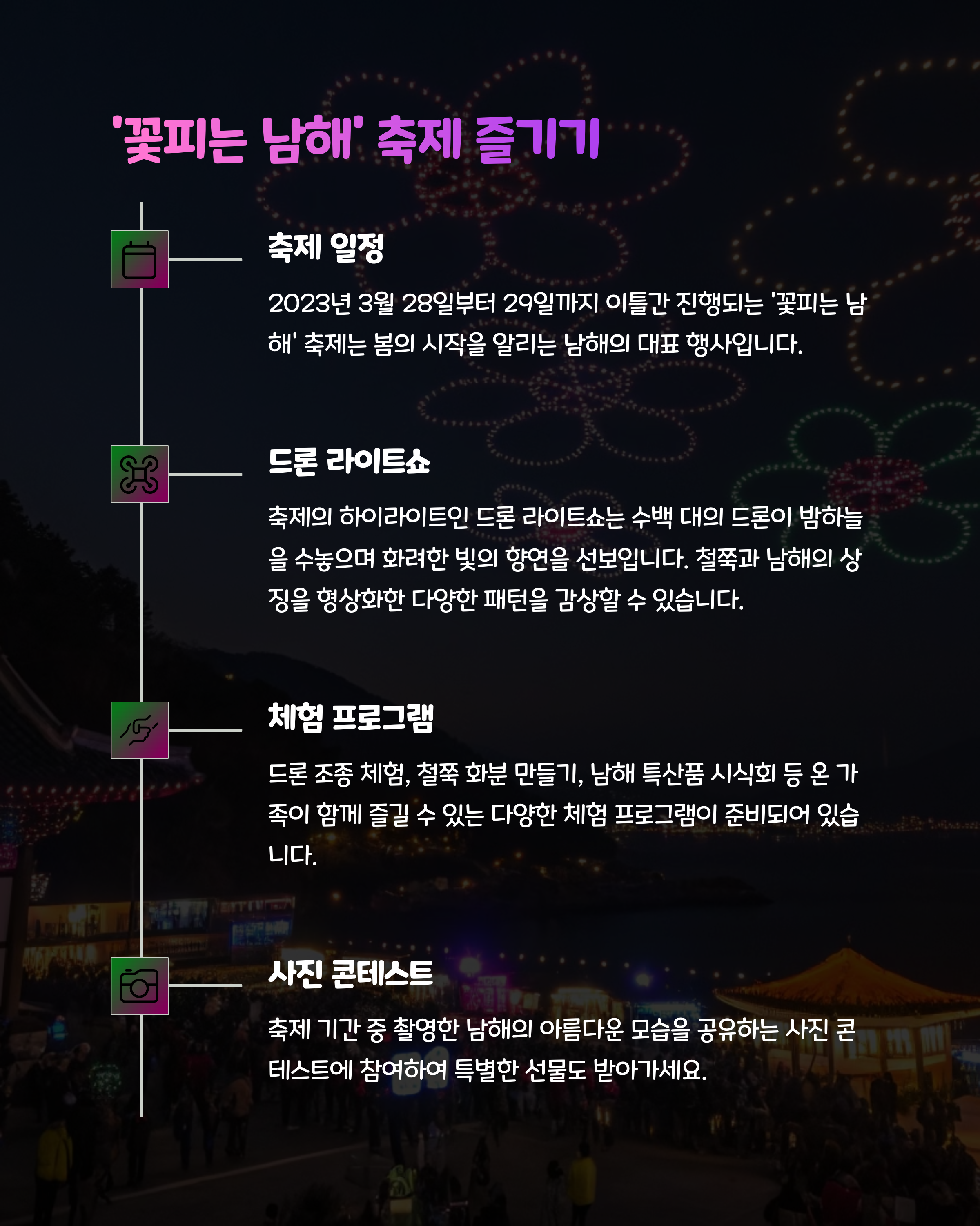 2025년 3월 28일부터 29일까지는 ‘꽃피는 남해’ 봄 축제가 열립니다. 화려한 드론 라이트쇼와 불꽃놀이, 인디밴드와 국악 등 문화 공연, 전통 의상 체험이나 솜사탕 만들기 같은 체험 부스까지 가족, 친구, 연인 누구와 함께해도 좋은 축제예요.