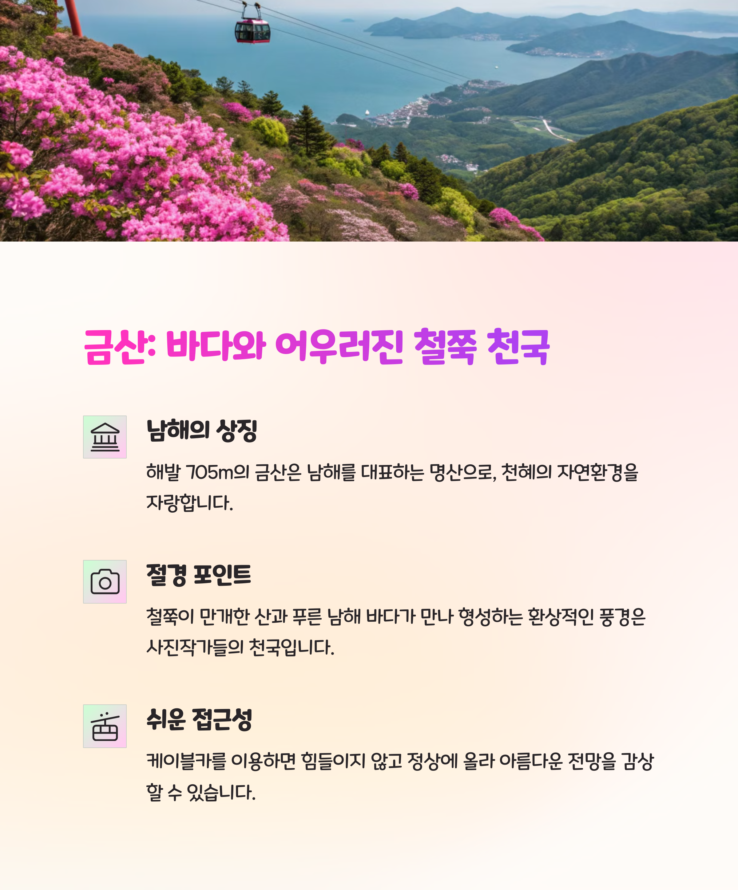 남해는 봄이면 형형색색 꽃들로 물들지만, 그중에서도 철쭉이 만개하는 순간은 정말 황홀합니다.