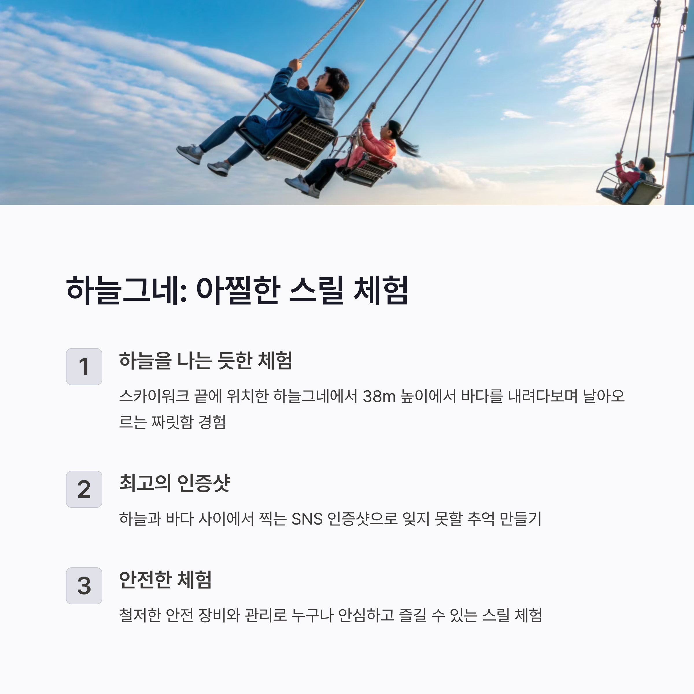 바다를 향해 날아오르는 순간 짜릿한 해방감을 느낄 수 있으며, 인생샷을 남기기에도 최고의 장소입니다.