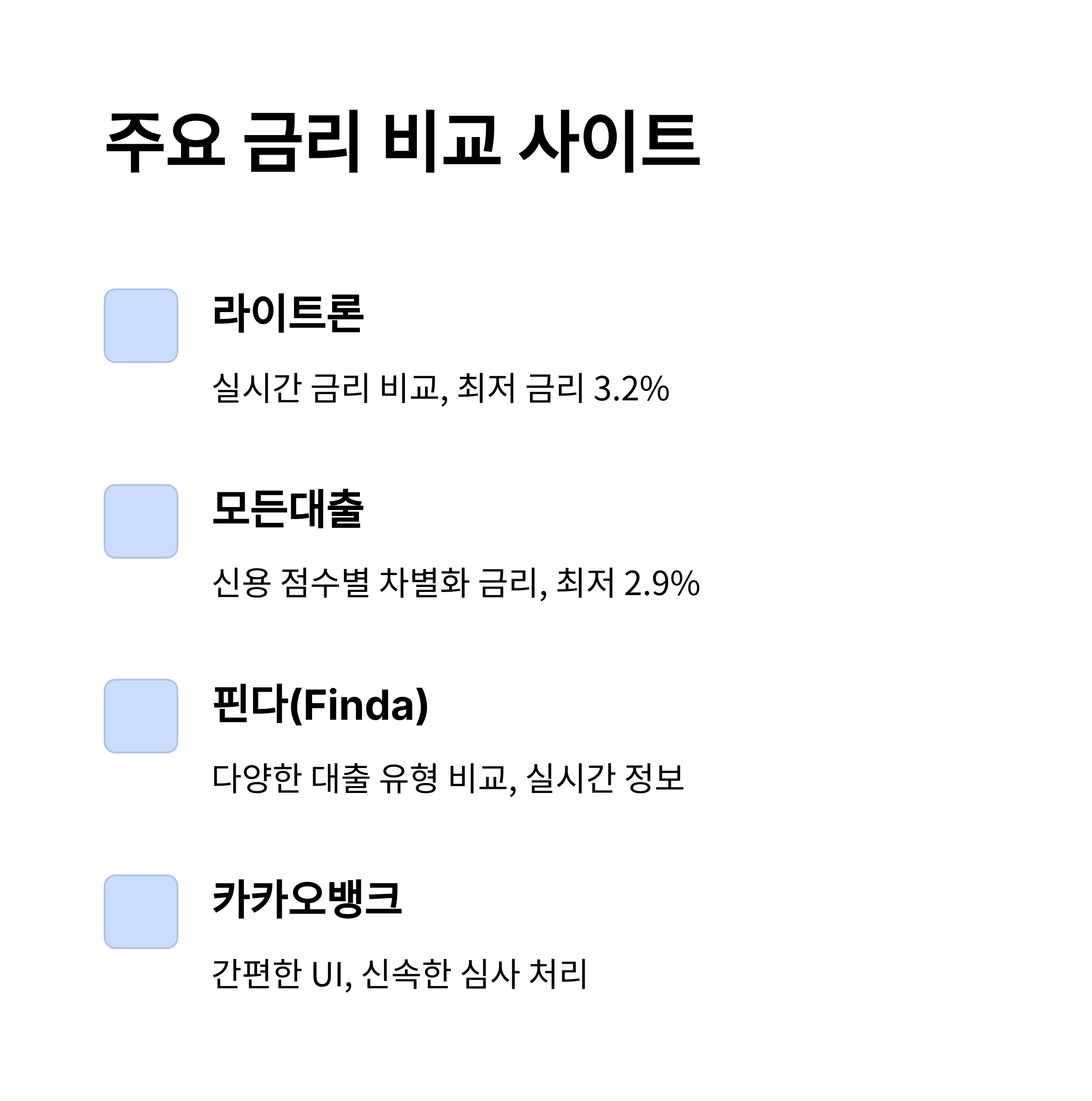 | 대출 금리 비교 사이트 | 여러 금융 기관의 대출 상품을 쉽게 비교 가능 |