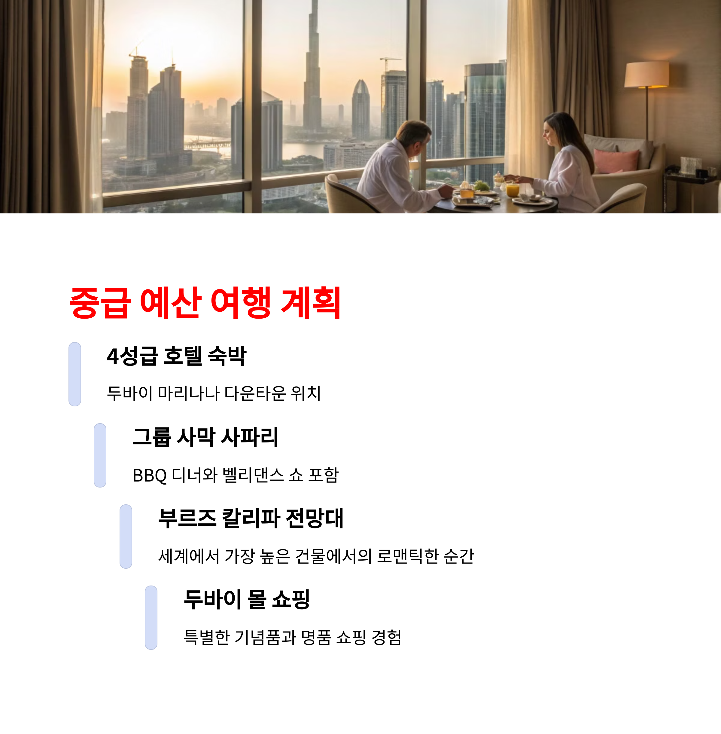 중급 예산이라면 하루는 사막 사파리, 하루는 휴양과 마리나 크루즈 등으로 여유롭고 균형 있는 일정을 계획해 보세요.
