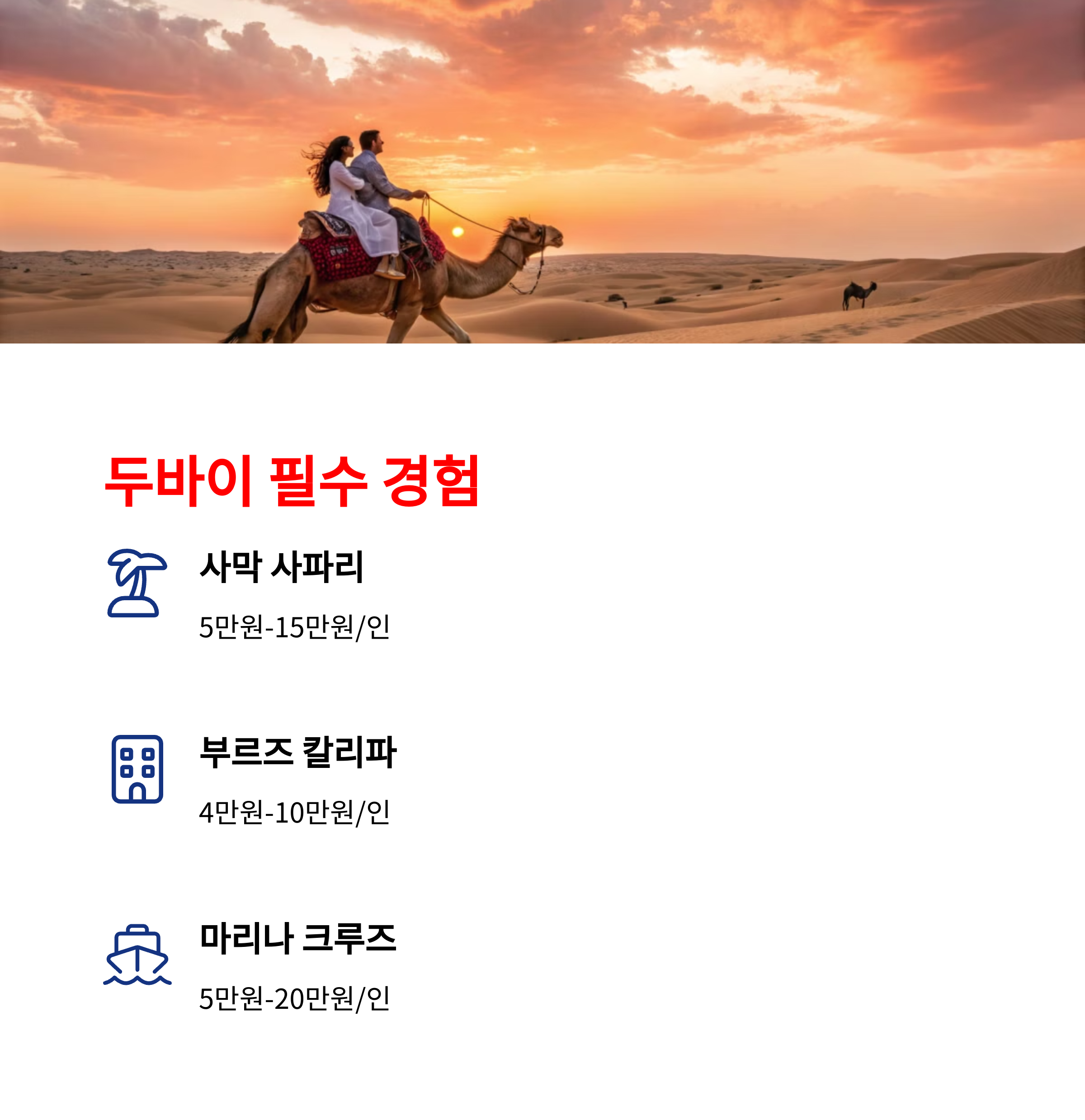 사막 사파리($50~$150)는 두바이의 이국적인 풍경을 가까이에서 체험할 수 있고, 부르즈 칼리파 전망대($40~$100)는 세계 최고층에서 바라보는 황홀한 전경을 선사합니다.♨️