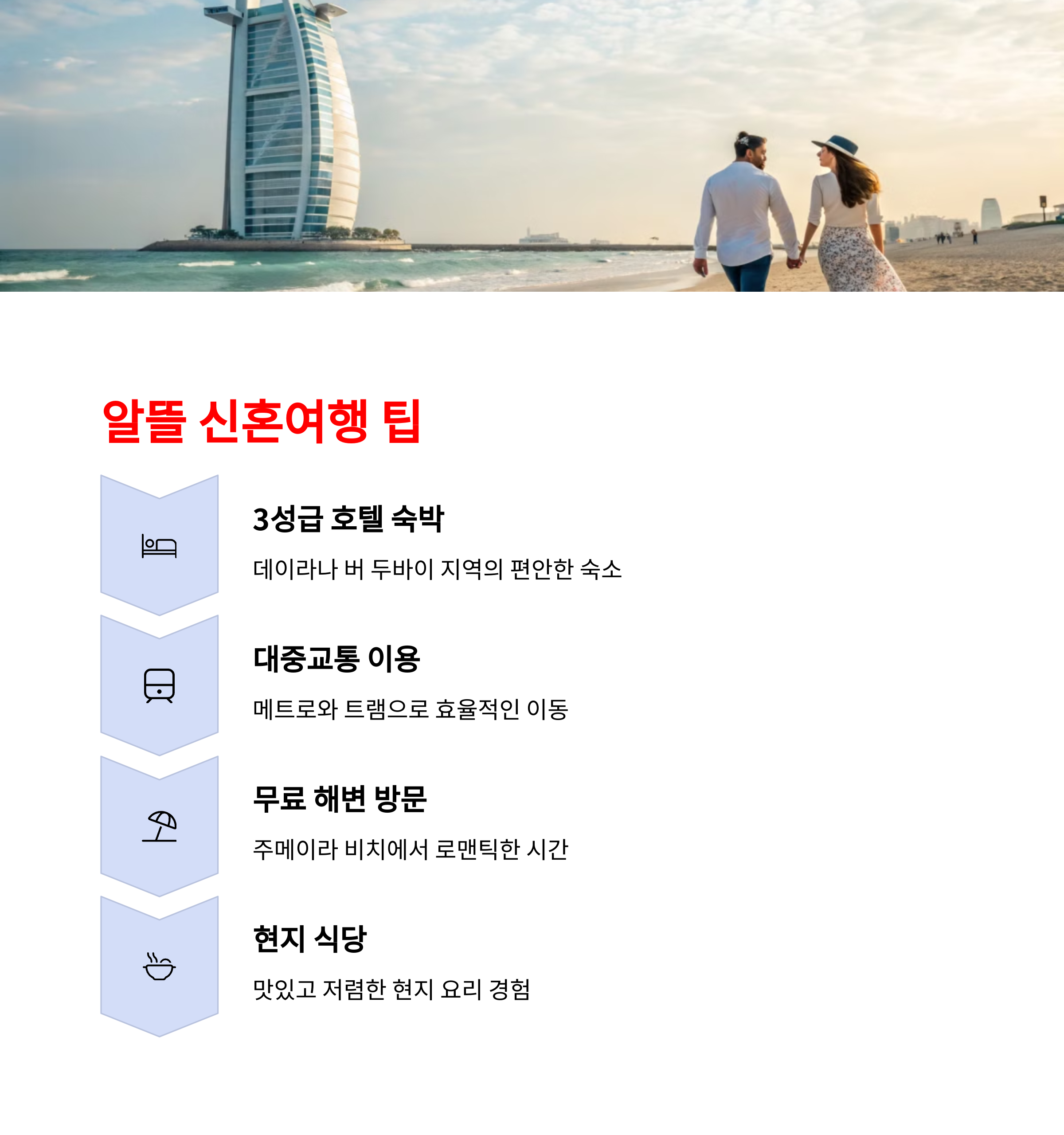 예산에 따라 여행의 스타일과 여유는 조금씩 달라질 수 있지만, 두바이는 모든 스타일을 만족시킬 수 있는 도시이기에 누구나 자기만의 방식으로 최고의 신혼여행을 꾸릴 수 있습니다.🚩