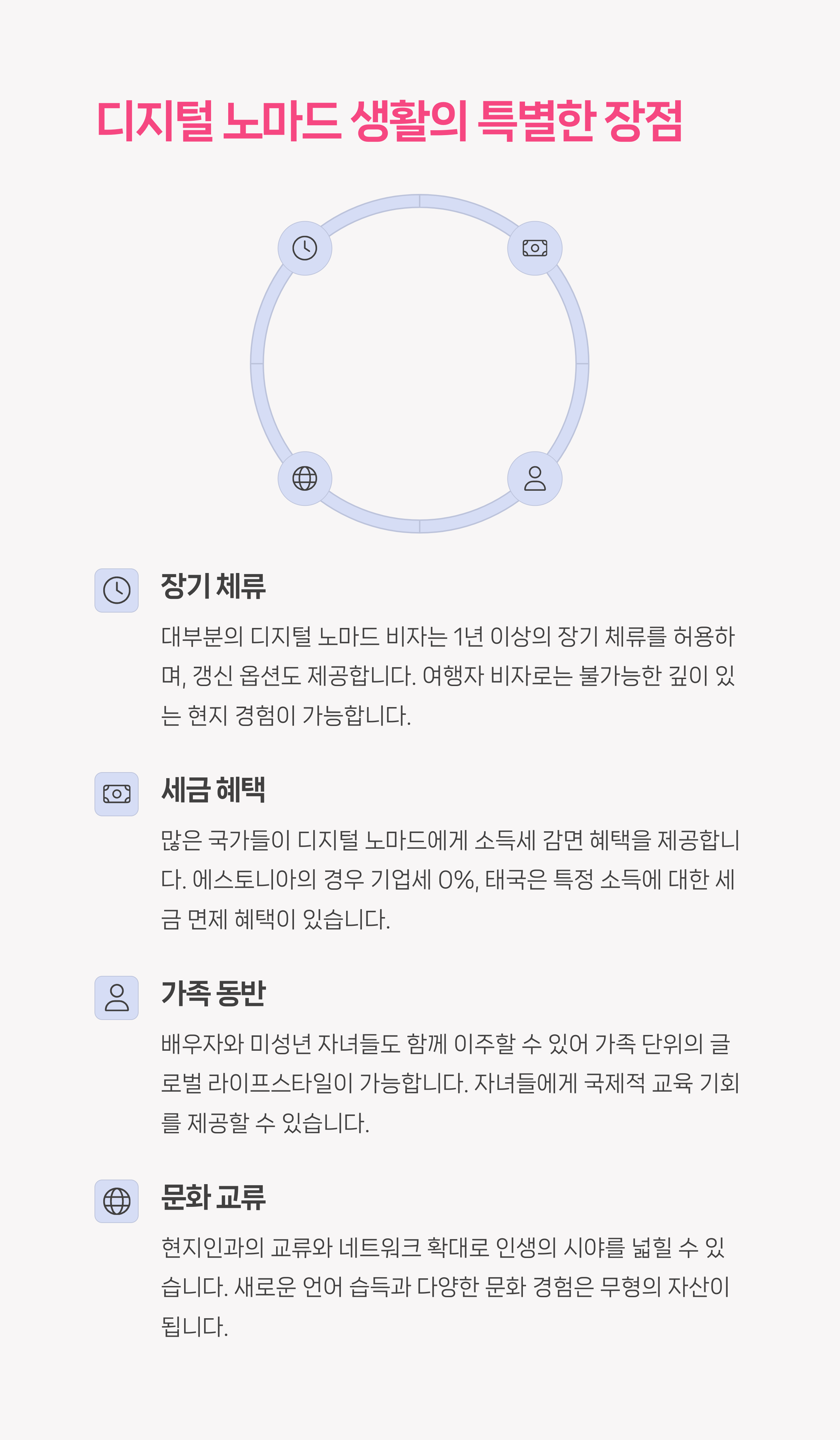 | 디지털 노마드 비자란? | 장기간 외국에 체류하며 일할 수 있는 특별 비자입니다. |