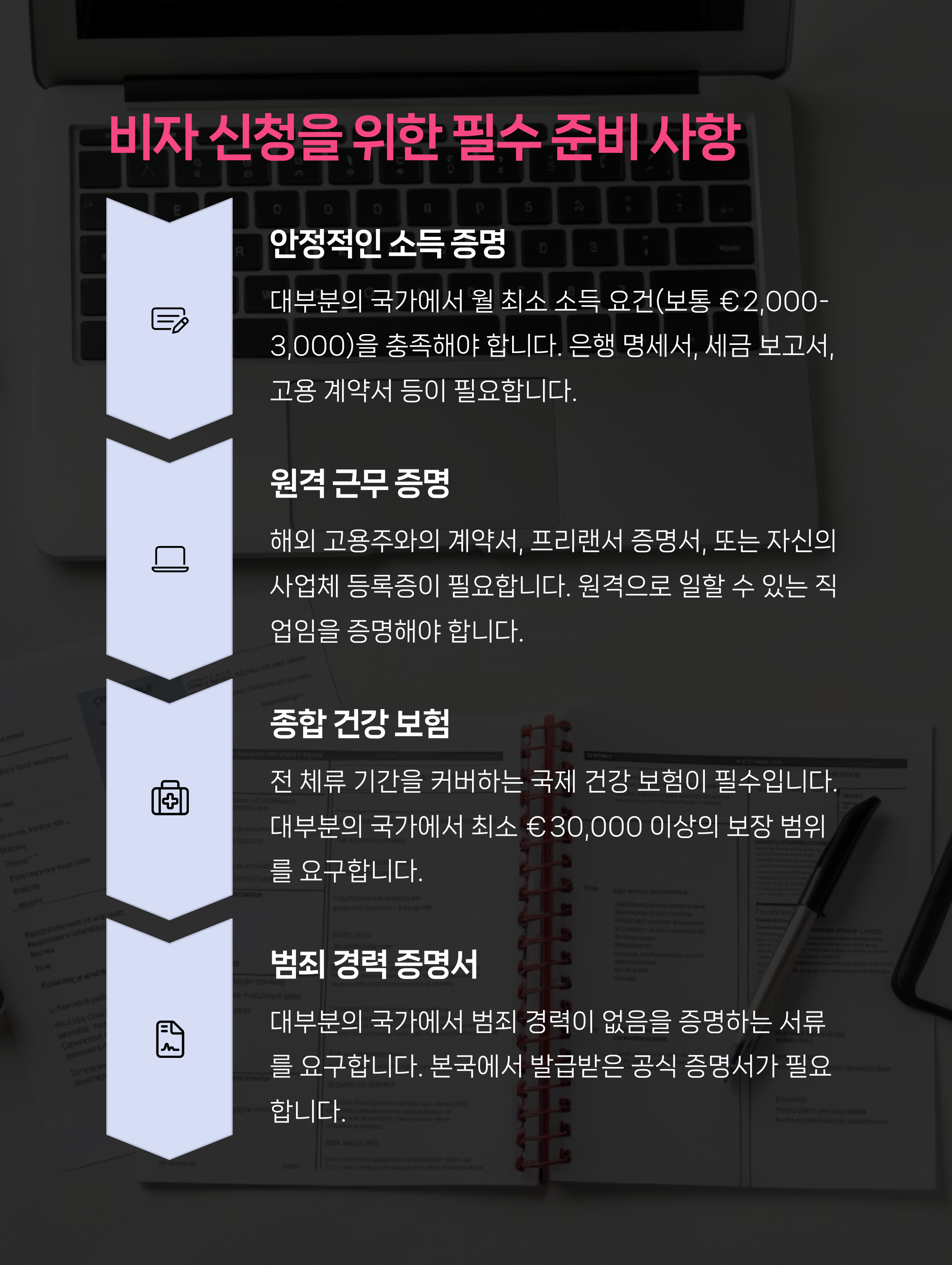 단, 국가마다 요구하는 조건이 상이하므로 신중한 준비와 자료 검토가 반드시 선행되어야 합니다.💡