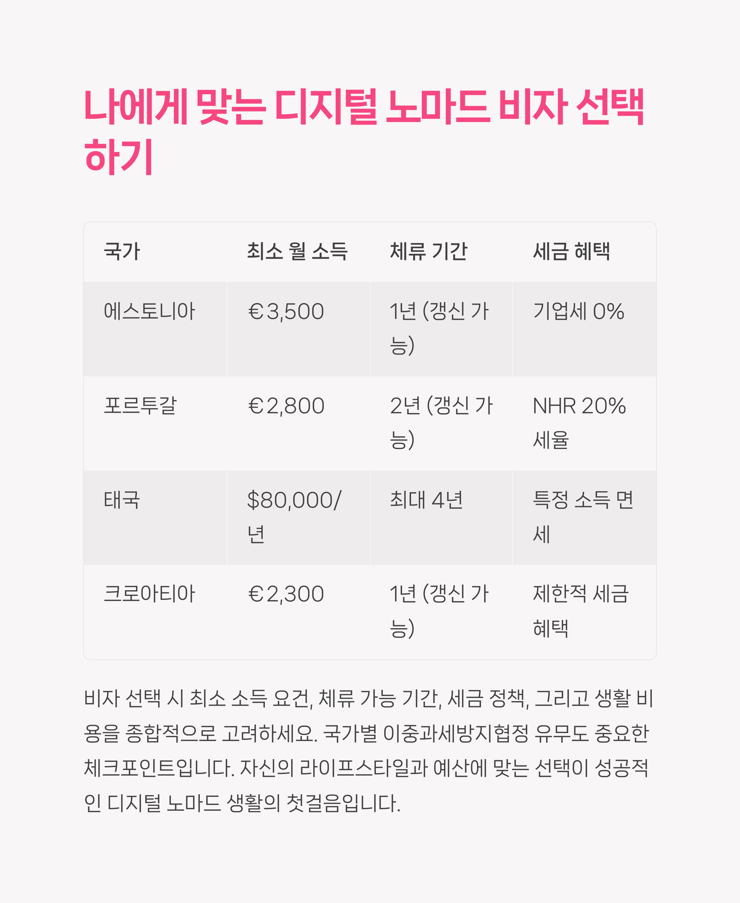 디지털 노마드라는 삶을 선택하고자 한다면, 이에 맞는 국가와 비자 제도를 현명하게 선택해야 합니다.💡