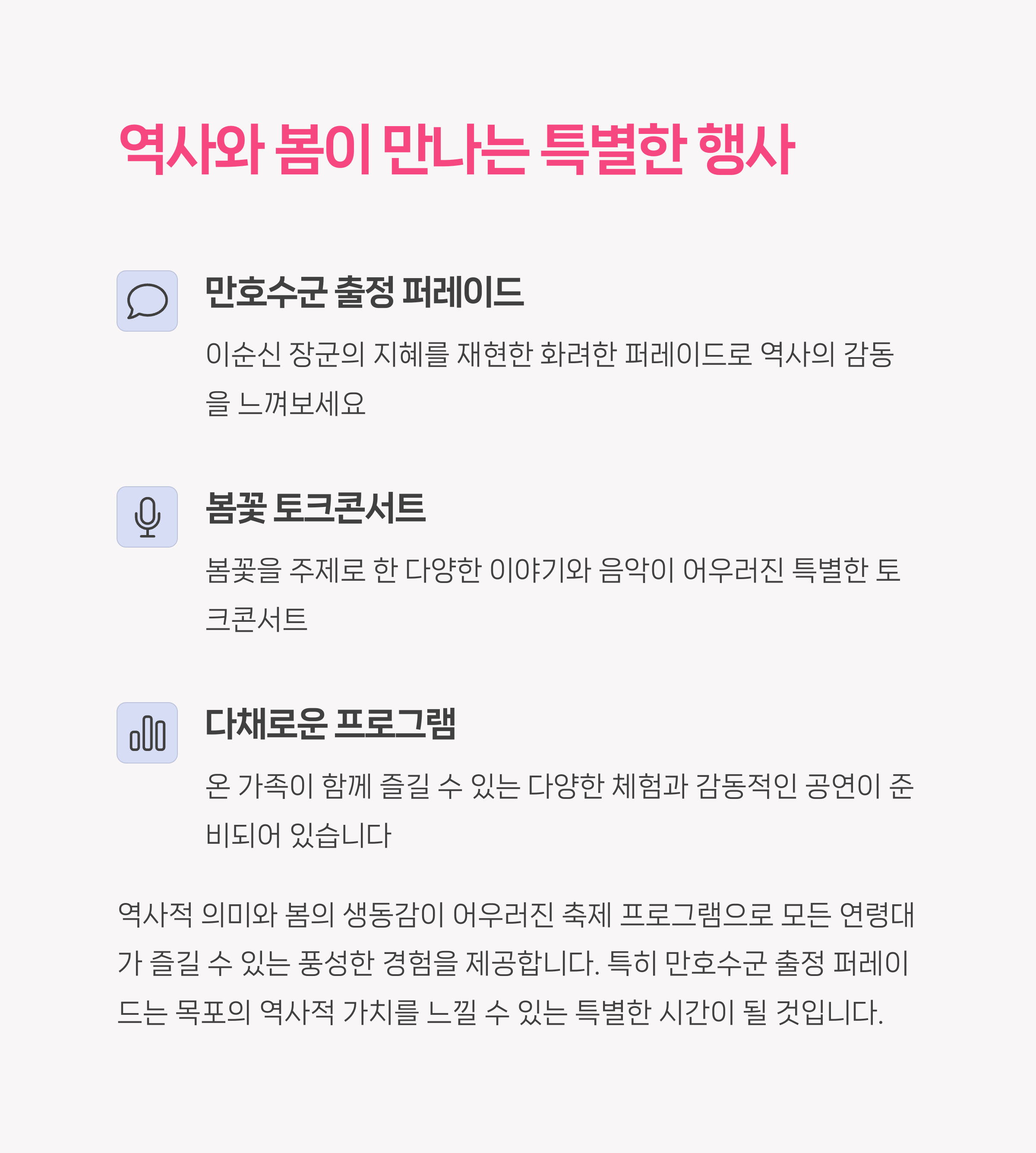 만호수군 출정 퍼레이드와 봄꽃 토크콘서트 등 다양한 이벤트가 준비되어 있습니다 🎶🎭.