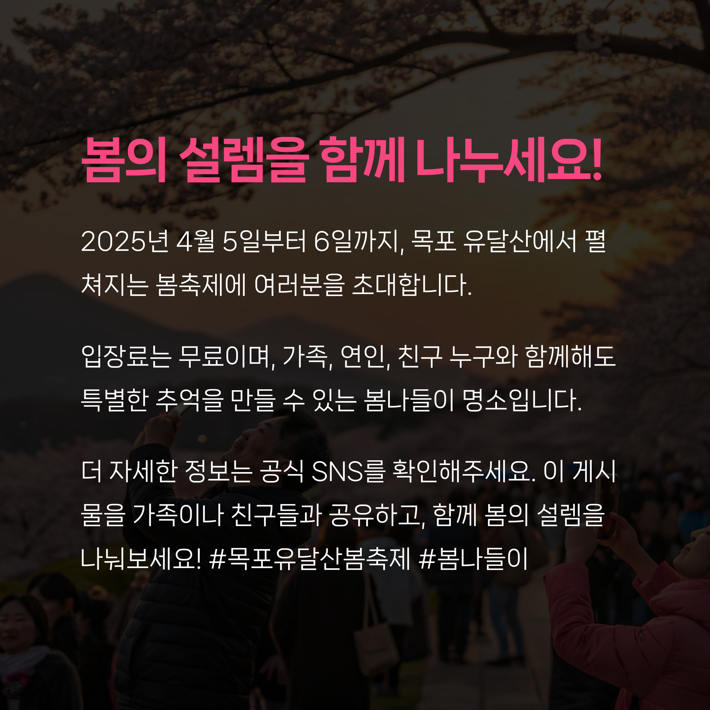 2025년 4월 5일부터 6일까지, 유달산 일대에서 펼쳐지는 봄축제는 벚꽃과 푸른 바다가 어우러져 이루어지는 환상적인 경험을 선사합니다.