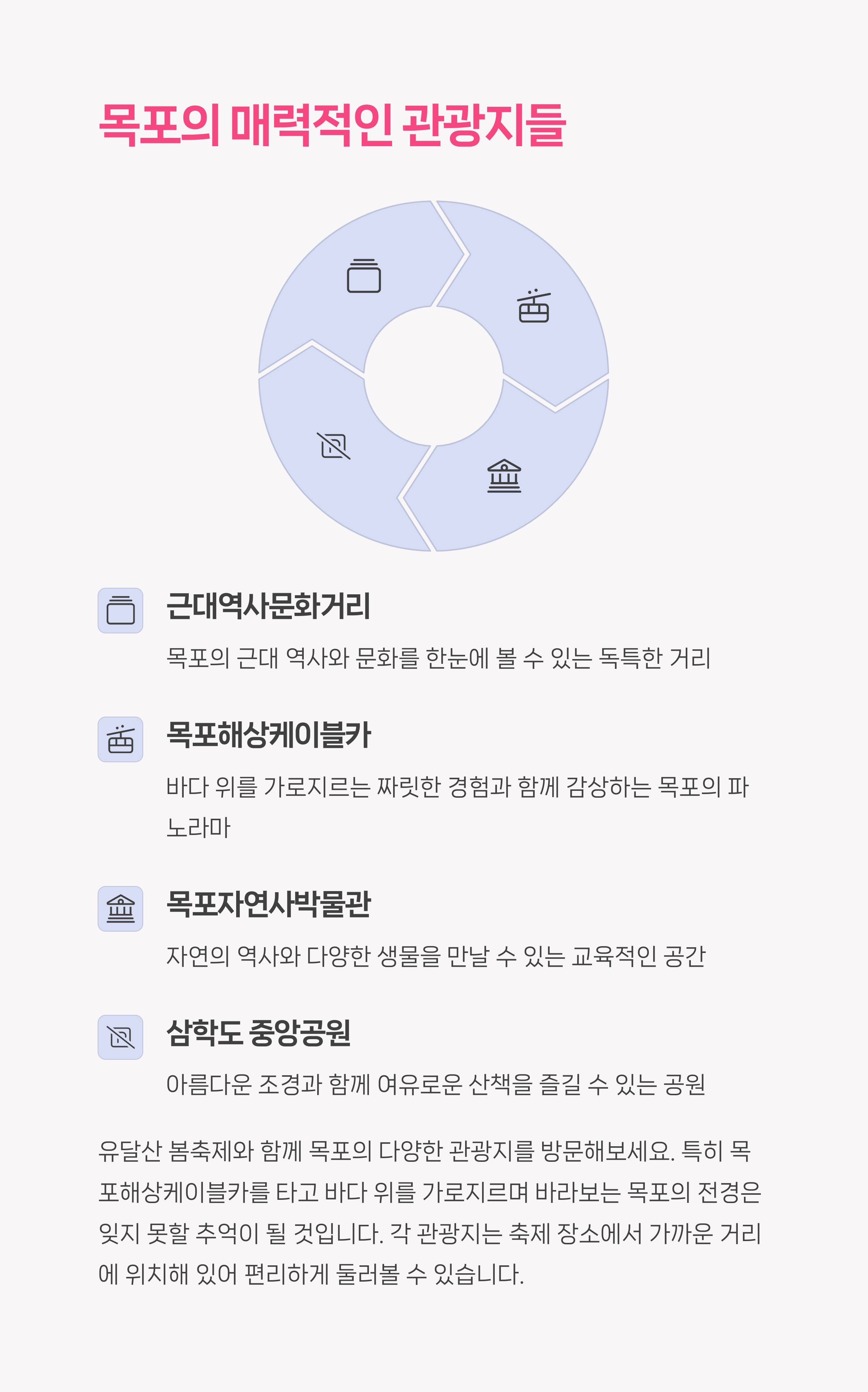 이 외에도 목포의 다양한 명소를 관광하면서, 유달산 축제를 더 풍성하게 즐길 수 있어요.
