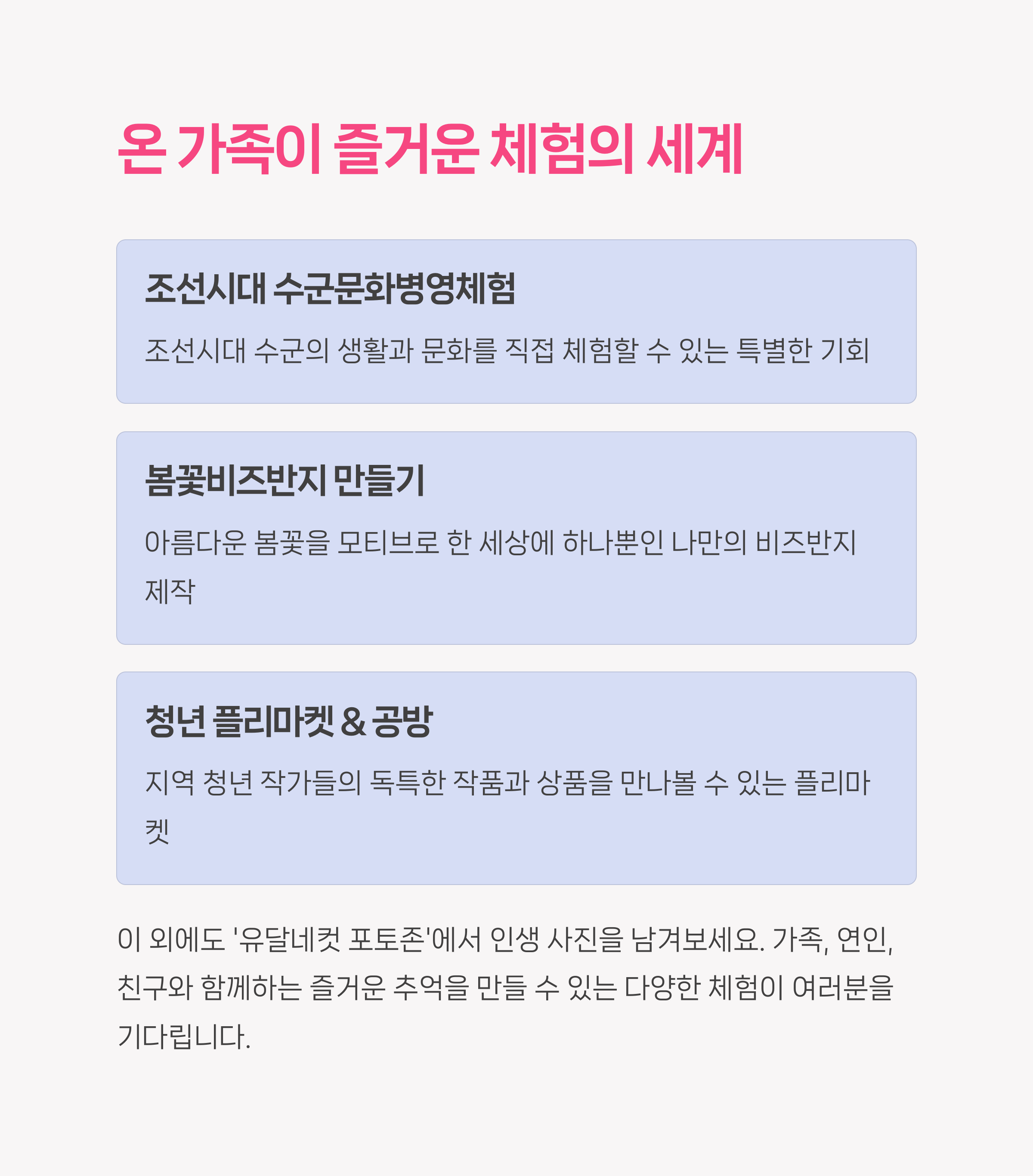 이번 축제에서는 다양한 볼거리와 체험으로 가족, 친구, 연인과 함께 특별한 시간을 보낼 수 있어요 🎉
