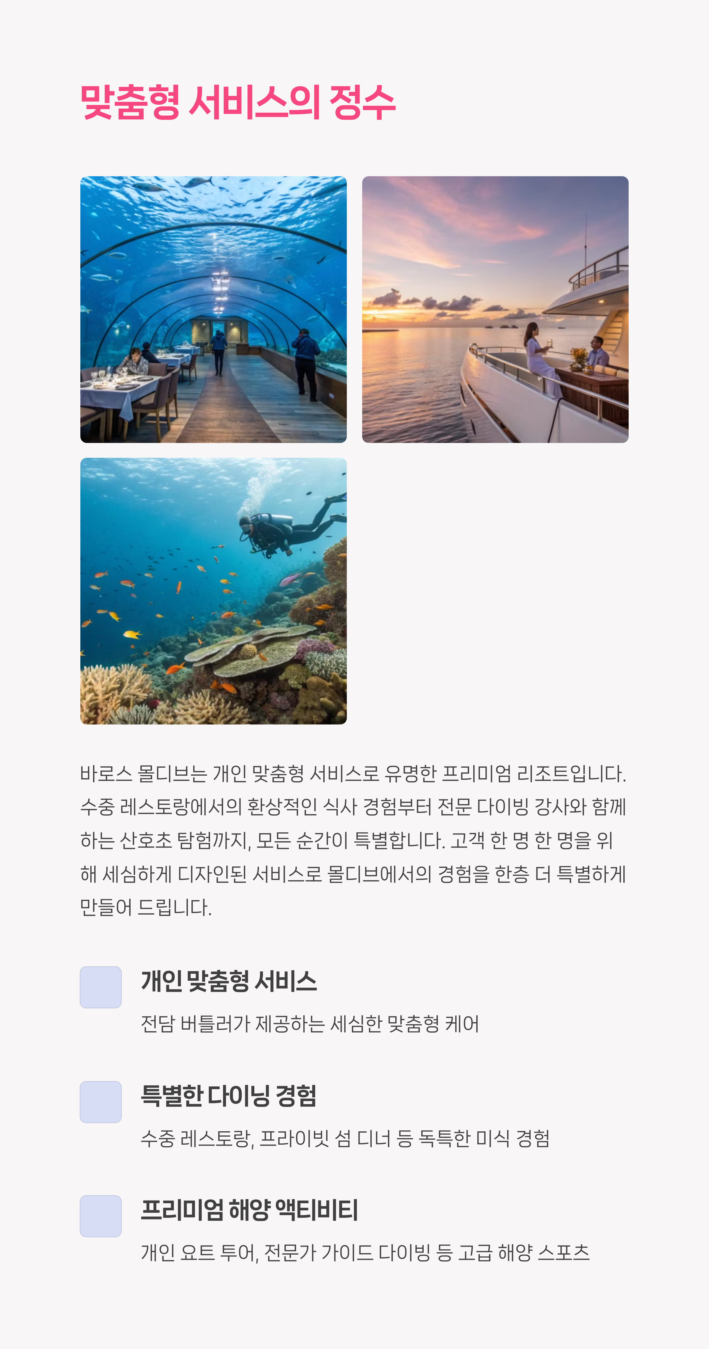 Baros Maldives는 전통적인 몰디브 스타일을 유지하면서도 맞춤형 서비스와 개인화된 경험을 제공하는 곳이랍니다.