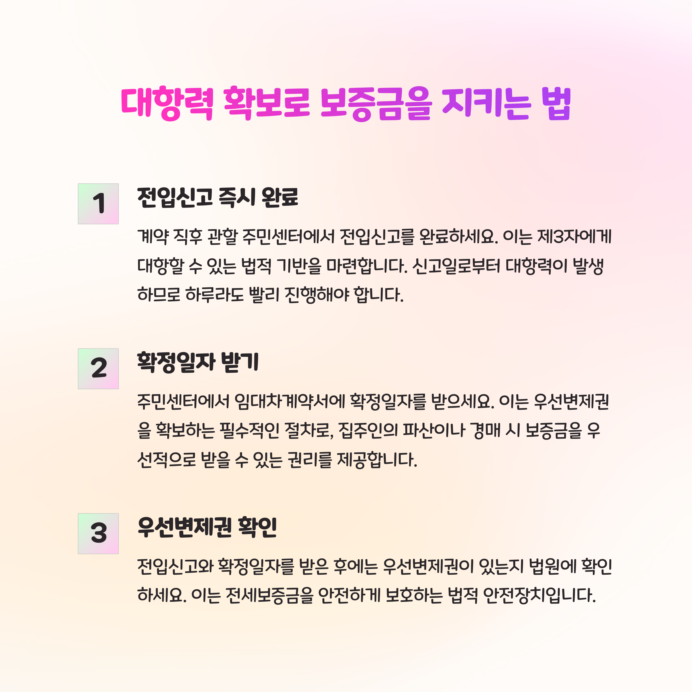 그렇기 때문에 대항력 확보 절차가 매우 중요해집니다. 입주 후 전입신고를 하고, 확정일자를 받아야만 주택임대차보호법에 따른 우선변제권이 생깁니다.🎯