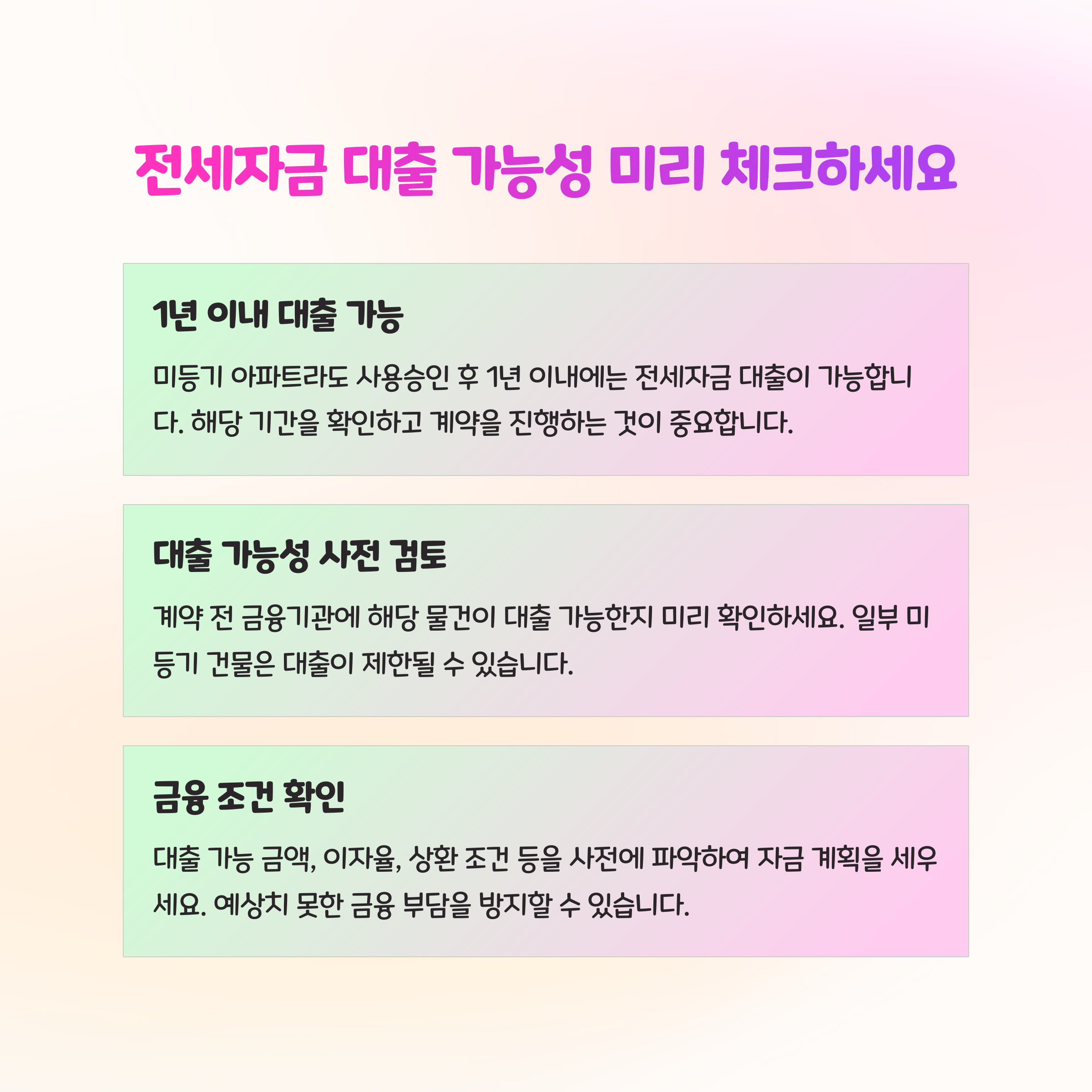 | 시세보다 저렴하지만 법적 위험 존재 | 임시사용승인 이후에만 가능 | 전세보증금 보호를 위한 장치 마련 |