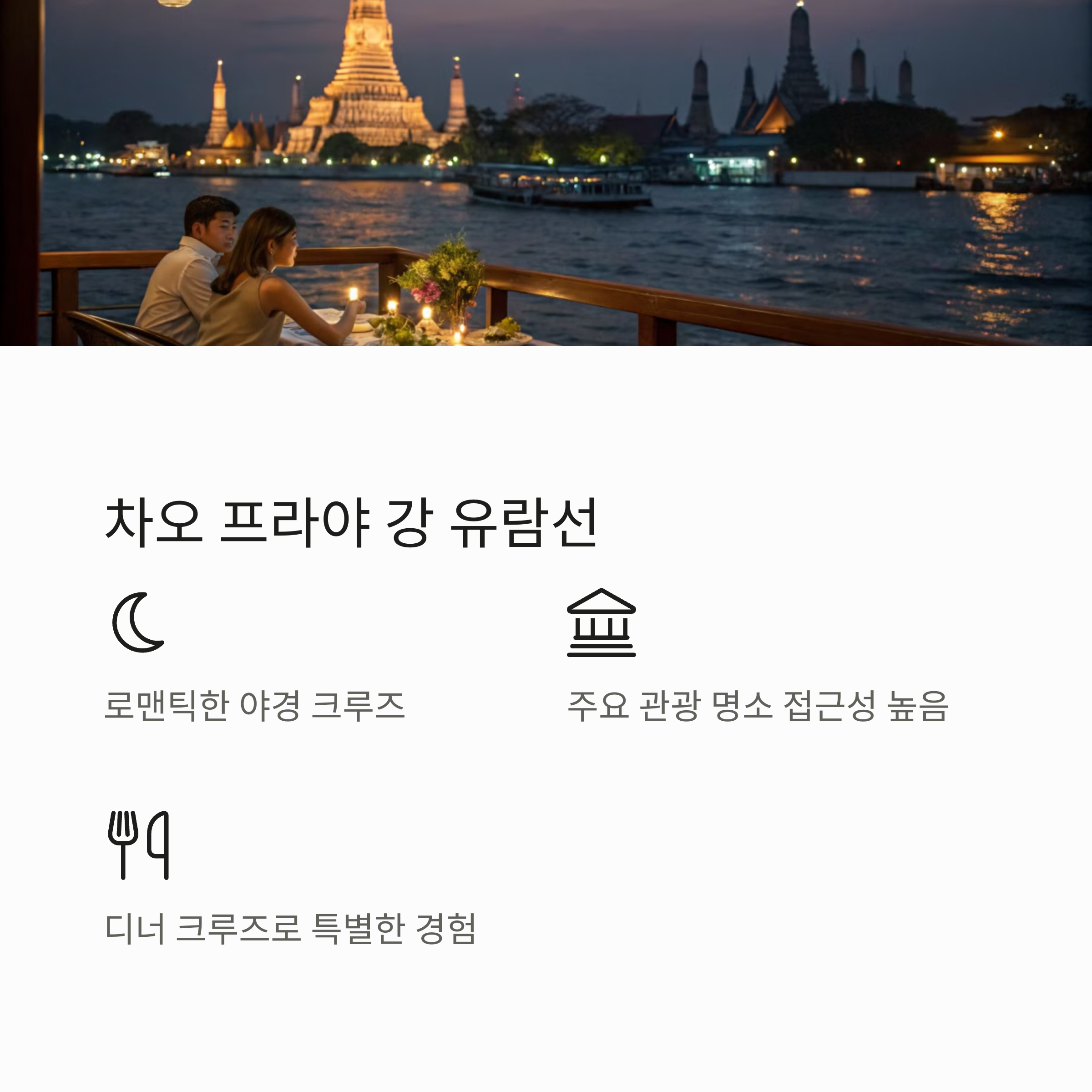 왓아룬, 왕궁, 아시아티크 등 주요 명소들이 물 위에서 연결되고, 로맨틱한 선상 뷰까지 함께 할 수 있답니다.