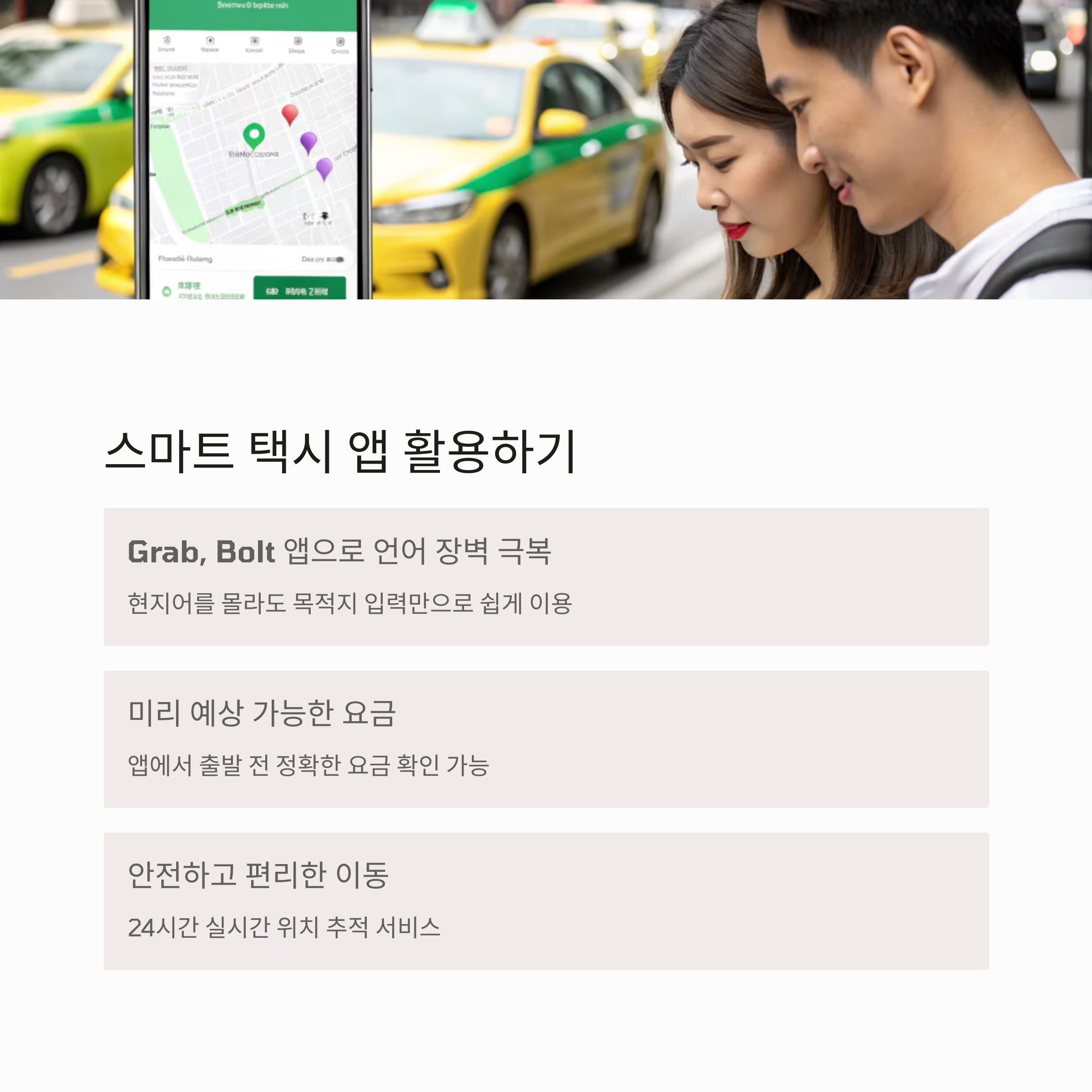 Grab, Bolt 같은 라이드 앱을 이용하면 미리 요금 확인 + 목적지 정확 입력이 가능해 언어 장벽 없이 편안하게 이동할 수 있어요.🥰