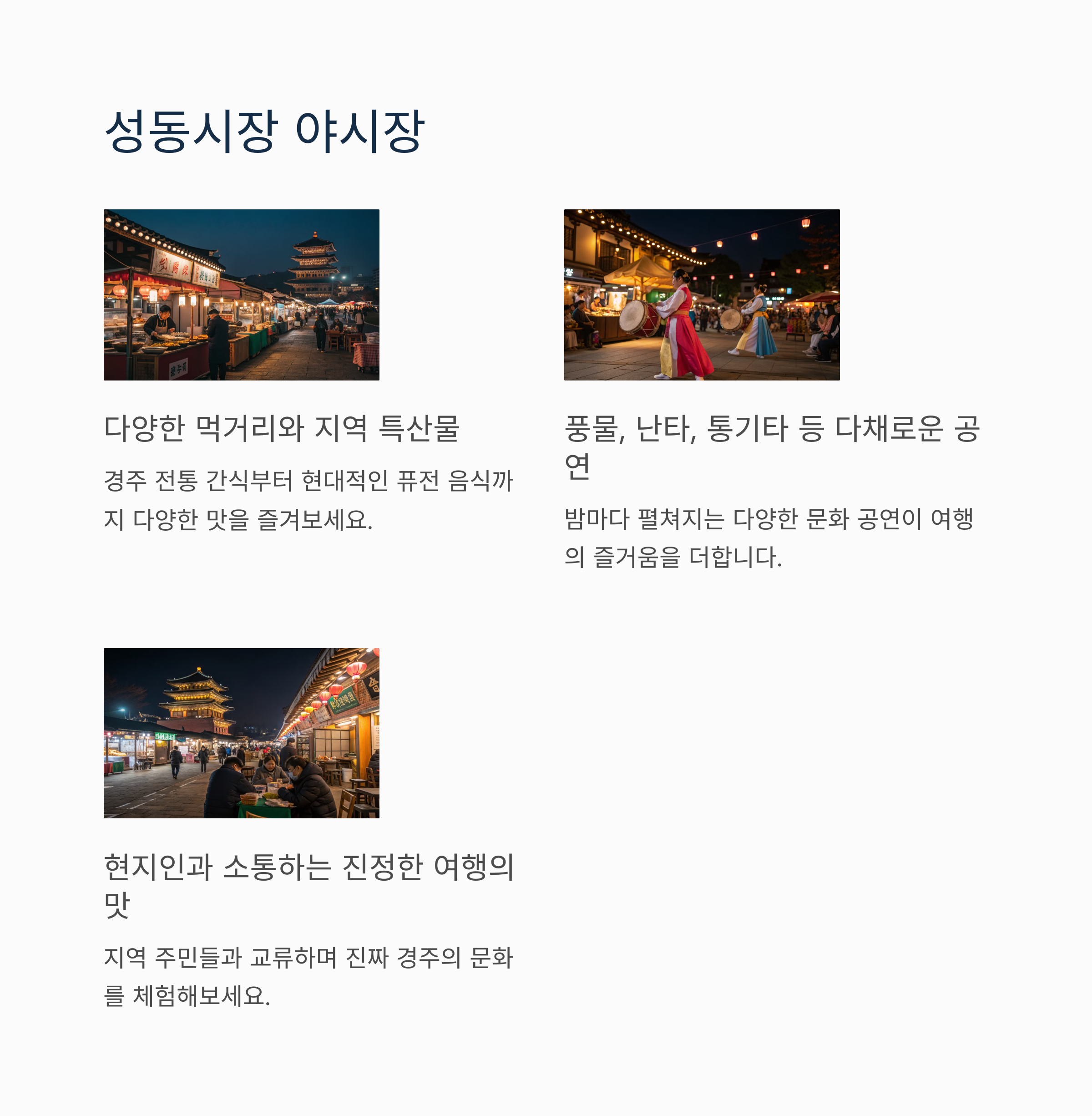 떡볶이, 호떡, 꼬치구이 등 다양한 길거리 음식이 가득하며, 시장 한편에서는 풍물공연과 거리 공연도 펼쳐집니다. 현지인과 관광객 모두에게 사랑받는 곳으로, 경주 여행의 마무리를 맛있고 흥겹게 할 수 있는 곳입니다.