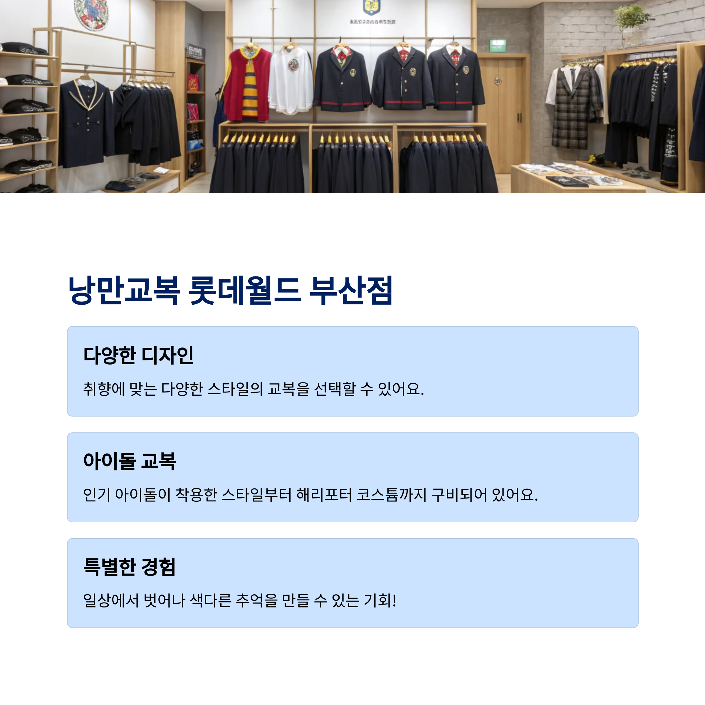 부산 롯데월드 주변에는 여러 교복 대여점이 있지만, 대표적인 곳은 ‘낭만교복’과 ‘심쿵교복’입니다.