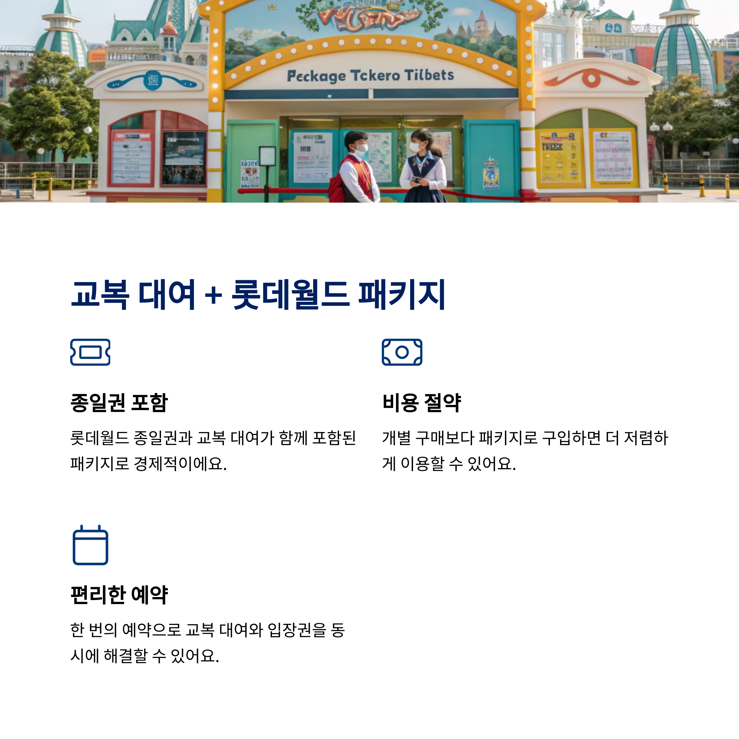 다양한 스타일의 교복을 대여할 수 있으며, 롯데월드 입구에서 가깝기 때문에 접근성이 뛰어납니다.