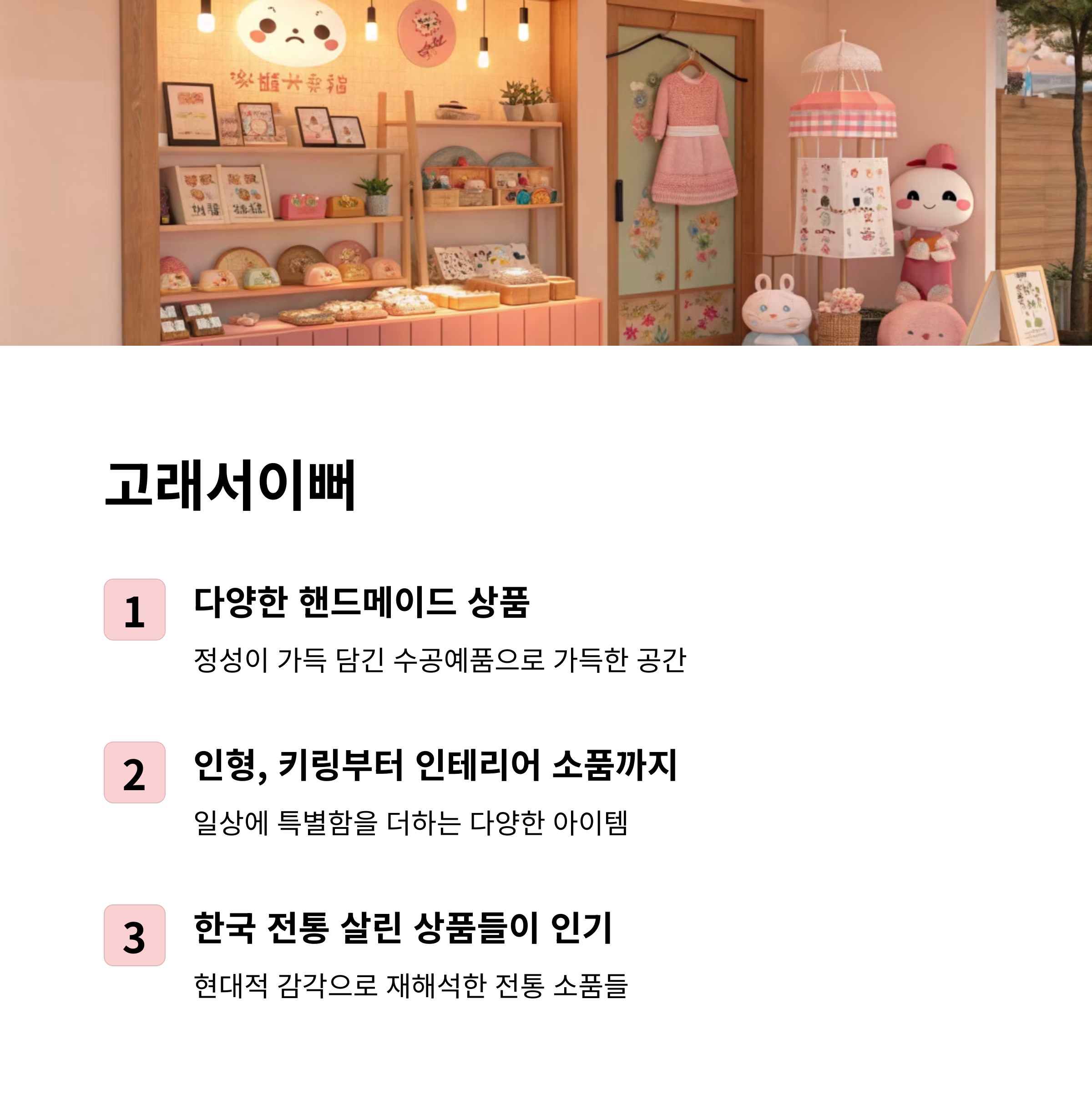 | 추천 이유 | 감성 넘치는 소품샵과 트렌디한 굿즈가 가득한 핫플레이스 |