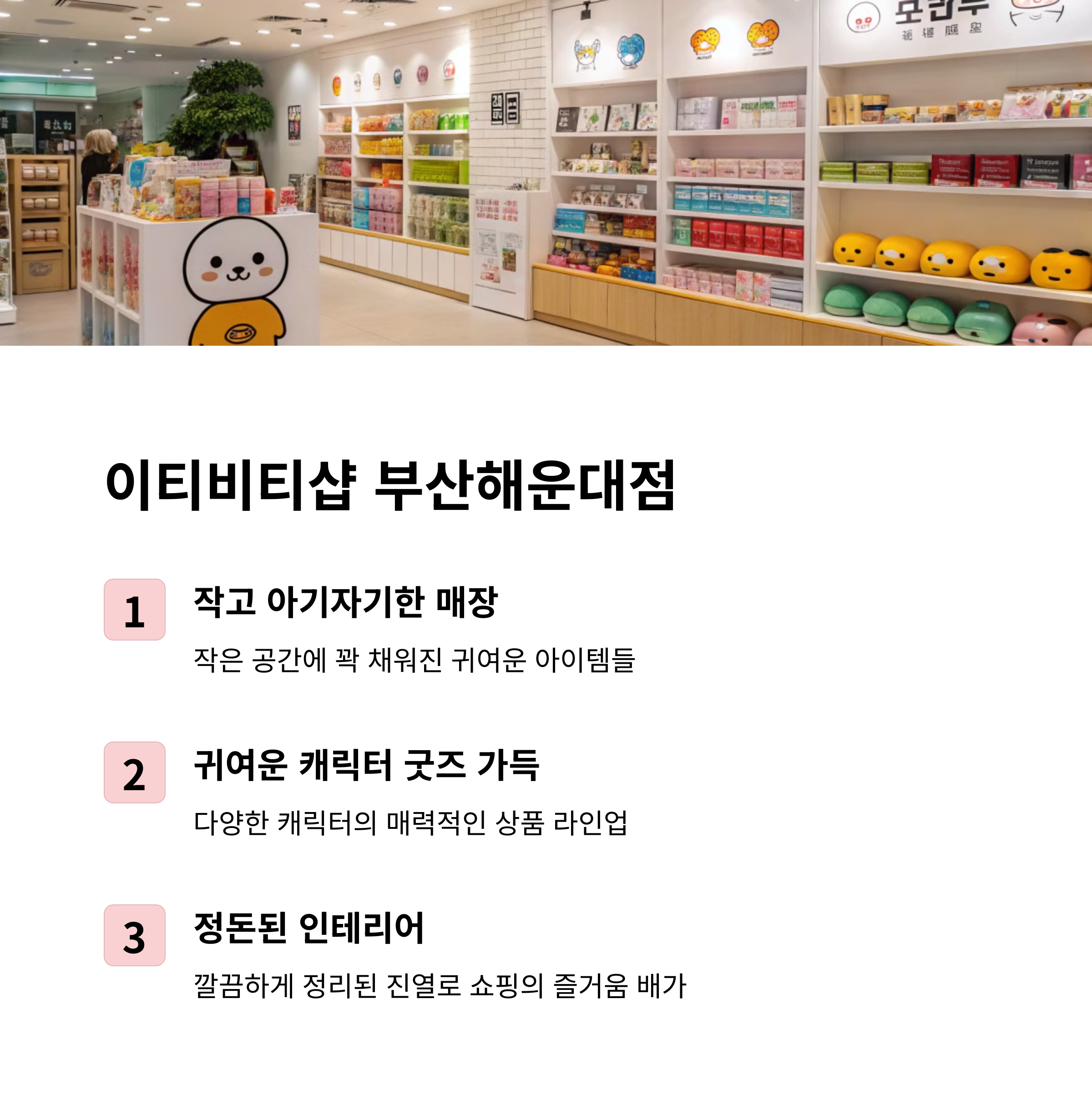 두 번째로 소개할 곳은 이티비티샵 부산해운대점입니다. 아기자기한 캐릭터 굿즈를 가득 채운 이곳은 트렌디한 디자인과 감각적인 인테리어가 돋보입니다.