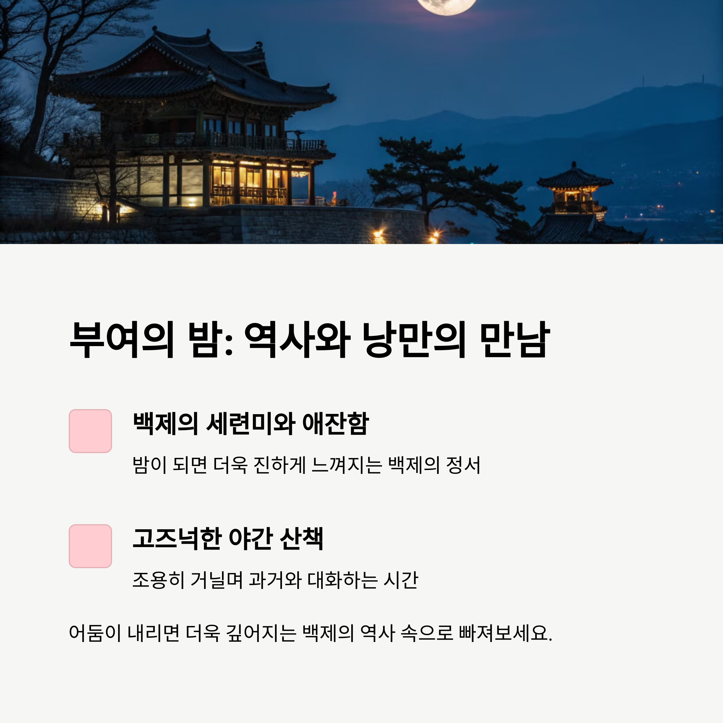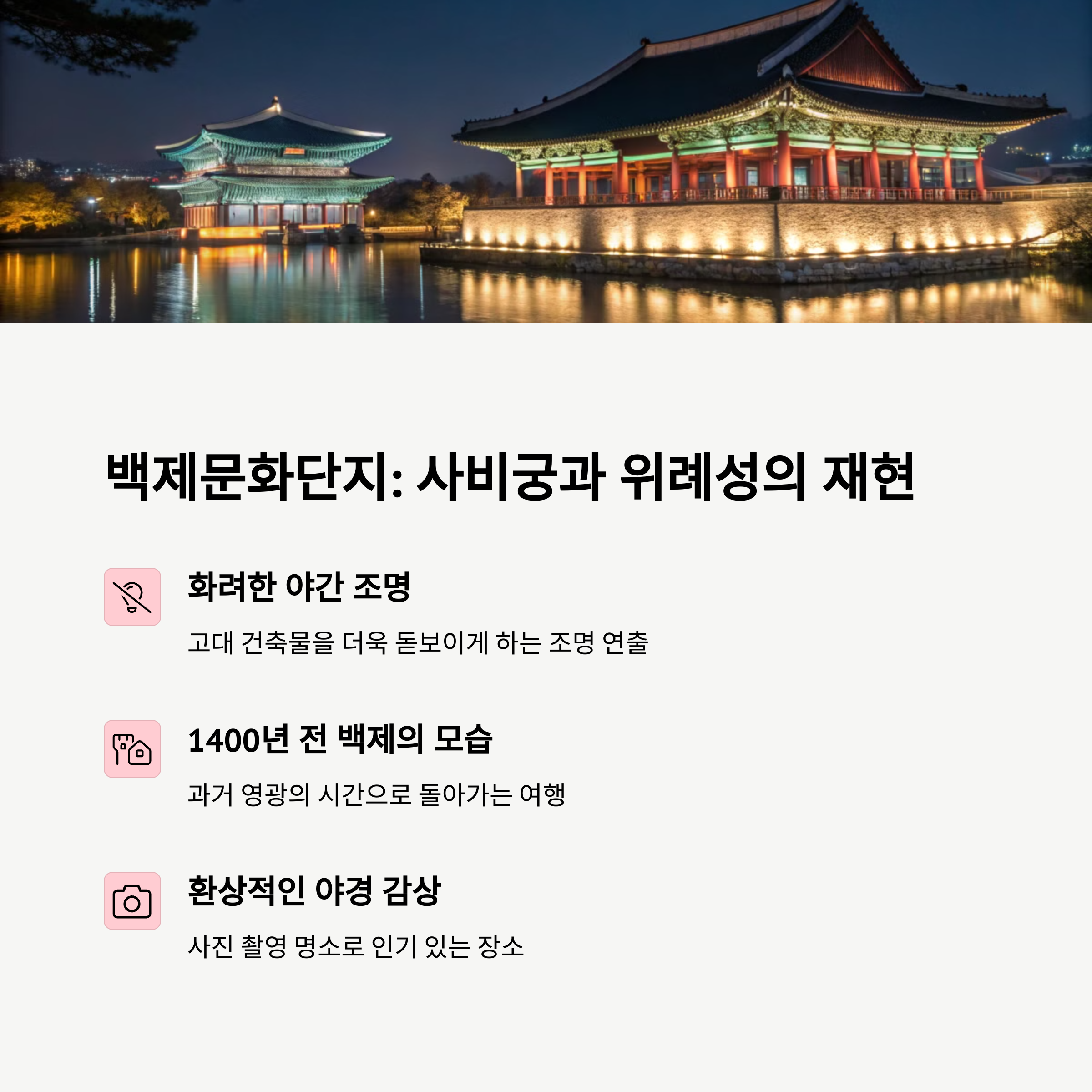 밤이 되면 백제의 유산은 조용히 빛나며, 고도(古都)의 시간으로 우리를 초대합니다.