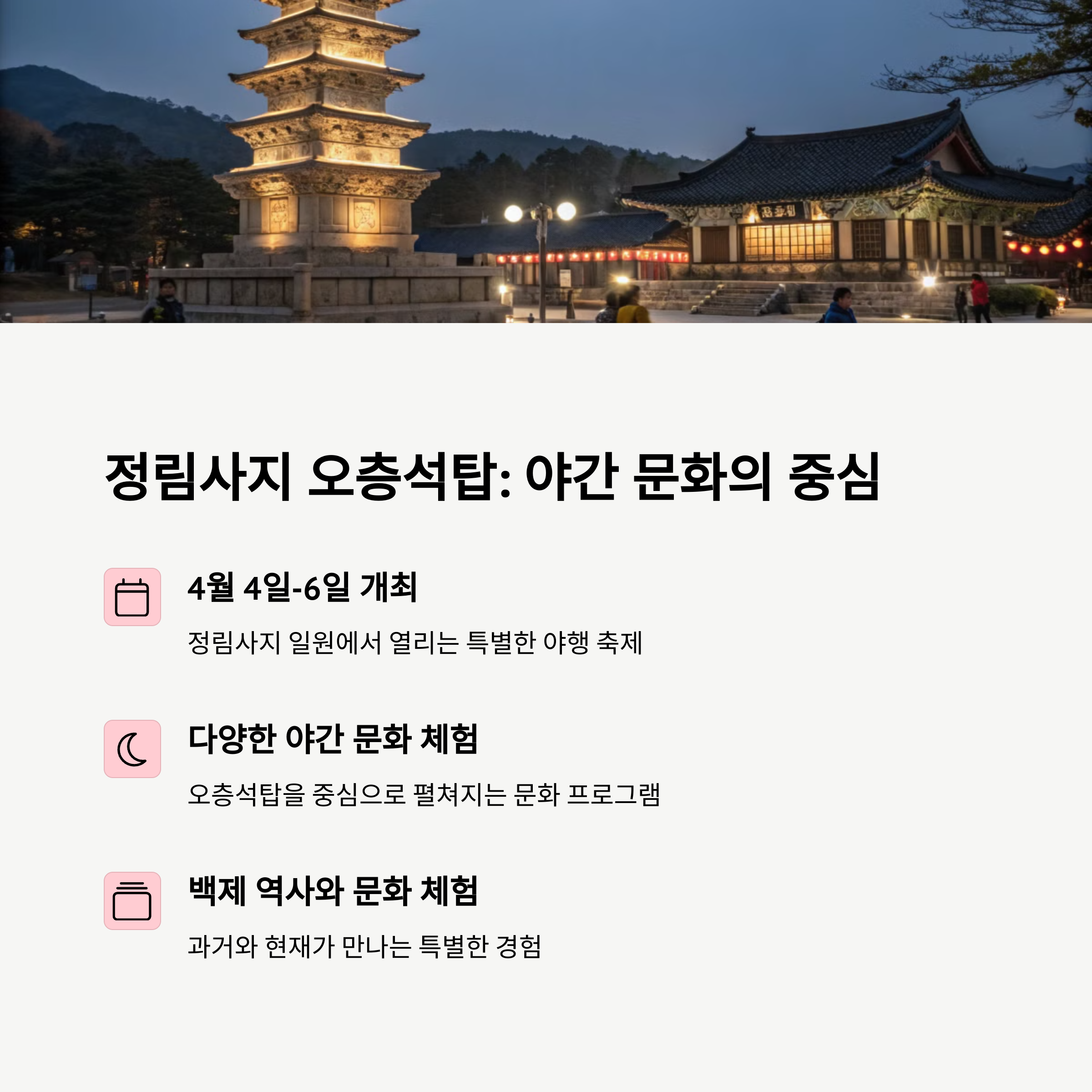 4월 4일부터 6일까지 정림사지 일원에서 열리며, 오층석탑을 중심으로 야간 조명, 해설투어, 체험 부스, 문화 공연 등 다채로운 콘텐츠가 운영됩니다.🎉