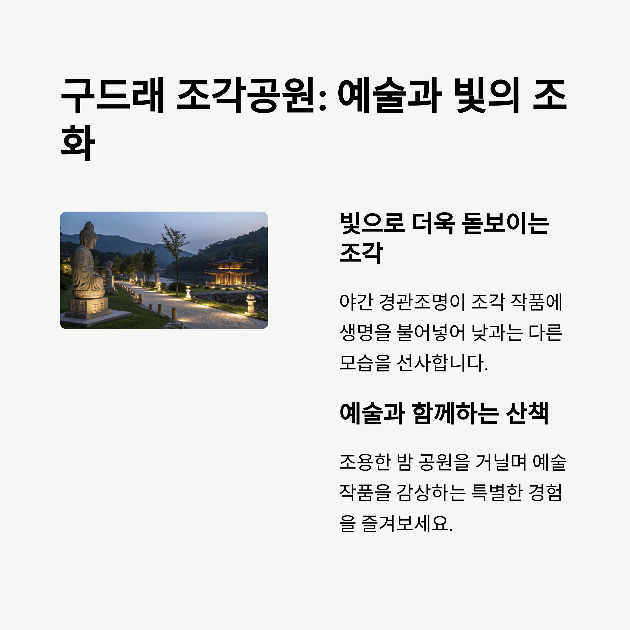 구드래 조각공원은 부여에서 가장 감성적인 야경 명소로, 조형물과 조명이 조화를 이루며 밤 산책길을 아름답게 밝혀줘요.📍