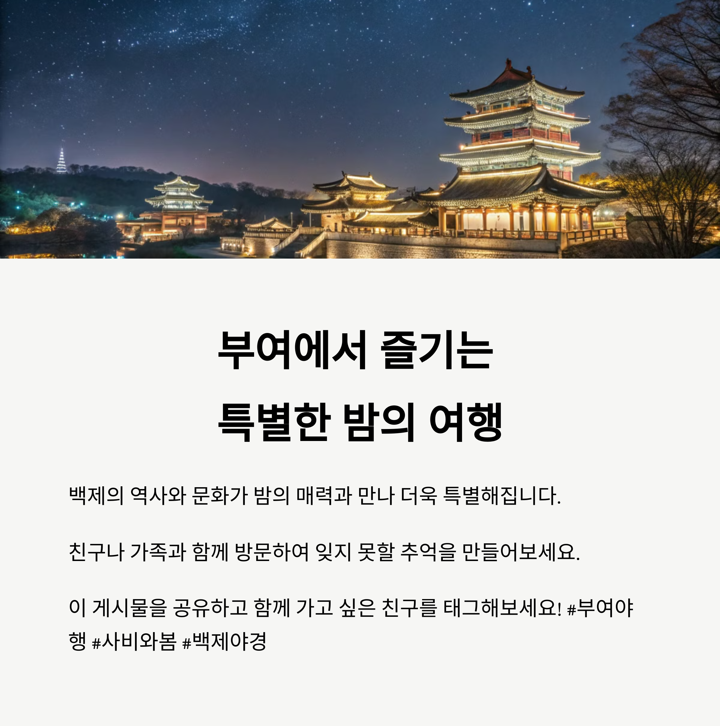 백제의 유산은 빛과 어우러질 때 더욱 특별한 감동을 줘요. 이번 봄, 역사와 감성이 만나는 부여의 밤으로 천천히 걸어보는 건 어떨까요? 😍