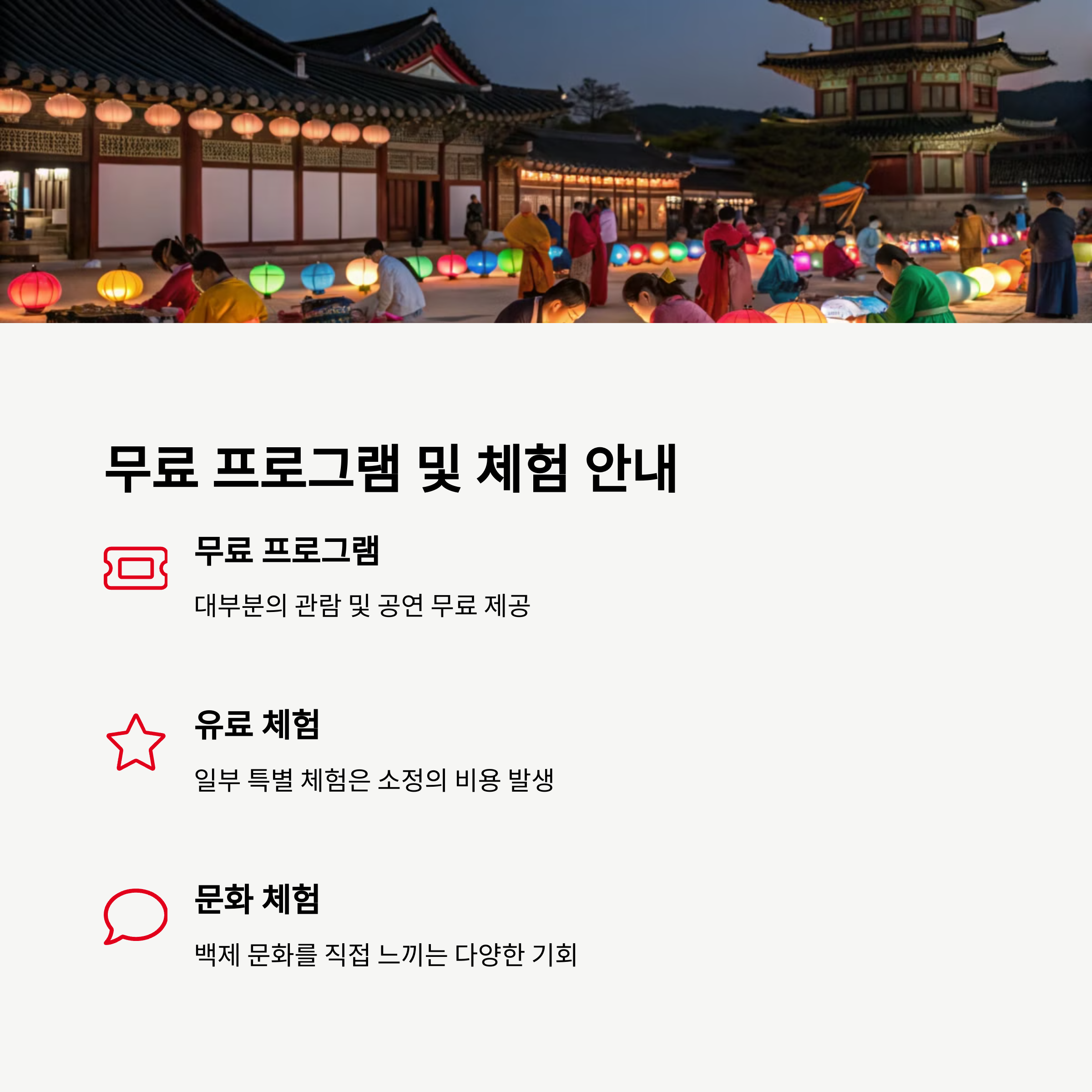 | 축제 일정 | 주요 장소 | 체험 정보 |