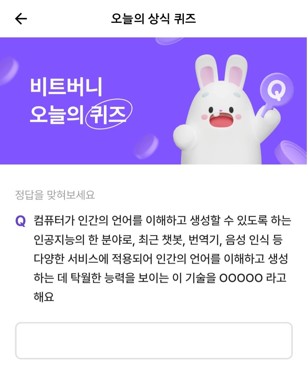 컴퓨터가 인간의 언어를 이해하고 생성할 수 있도록 하는 인공지능의 한 분야로, 최근 챗봇, 번역기, 음성 인식 등 다양한 서비스에 적용되어 인간의 언어를 이해하고 생성하는데 탁월한 능력을 보이는 이 기술을 OOOOO라고 해요!