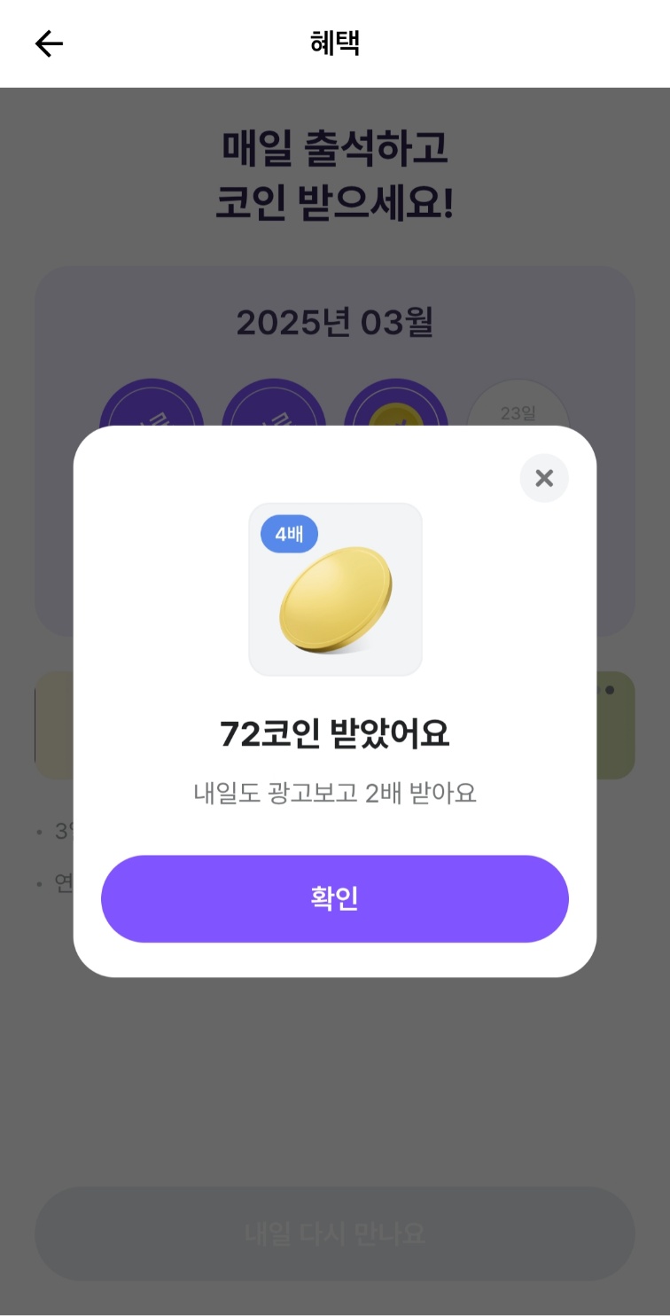 매일 출석체크만 해도 코인을 주는데요. 오늘 저는 출석 더블 이벤트로 72 코인을 받았습니다!