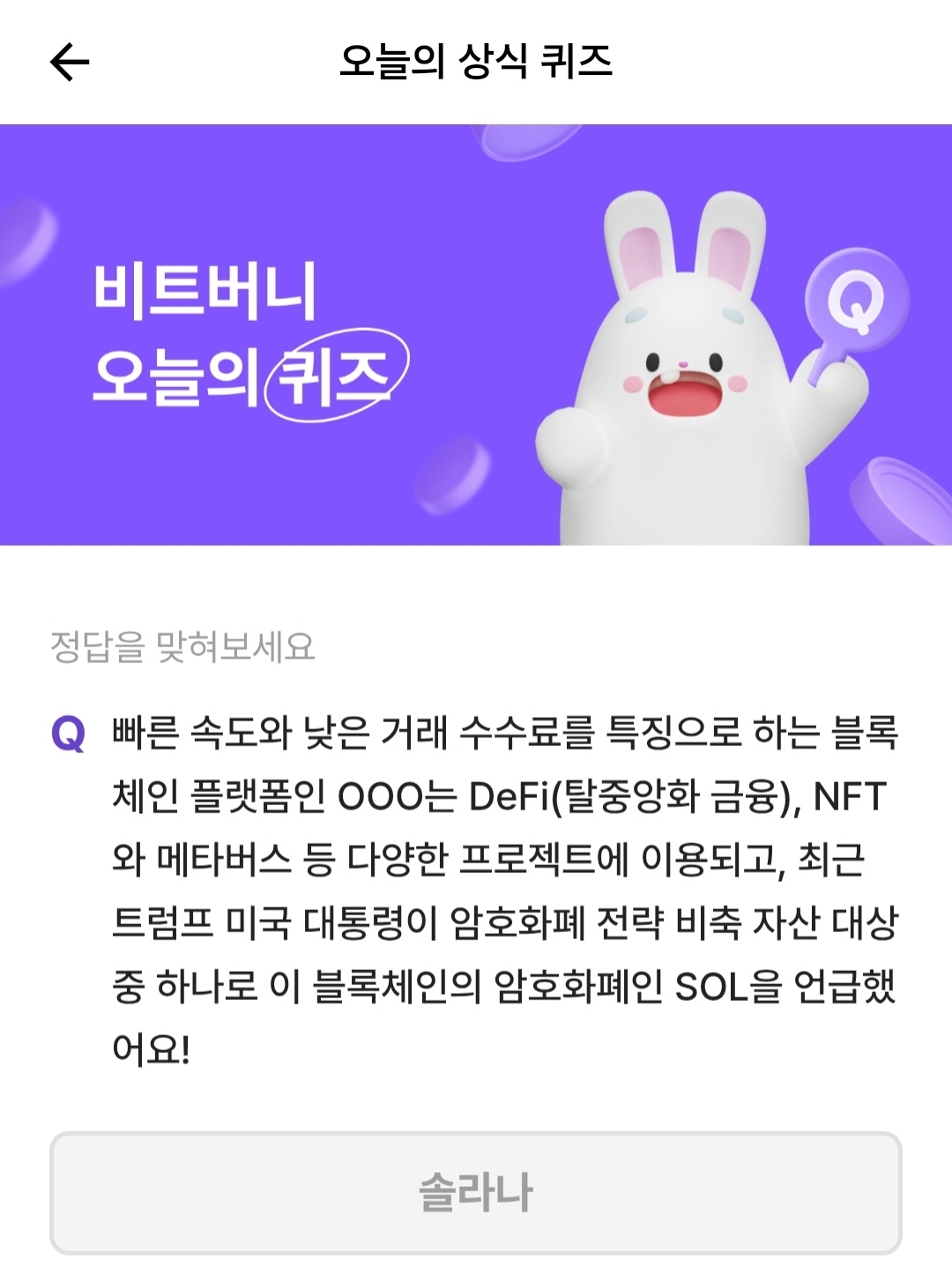빠른 속도와 낮은 거래 수수료를 특징으로 하는 블록체인 플랫폼인 OOO는 DeFi(탈중앙화 금융), NFT와 메타버스 등 다양한 프로젝트에 이용되고, 최근 트럼프 미국 대통령이 암호화폐 전략 비축 자산 대상 중 하나로 이 블록체인의 암호화폐인 SOL을 언급했어요! (초성힌트: ㅅㄹㄴ)