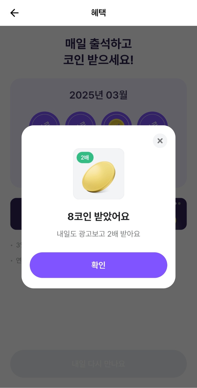 매일 출석체크만 해도 코인을 주는데요. 오늘 저는 출석 더블 이벤트로 8 코인을 받았습니다!