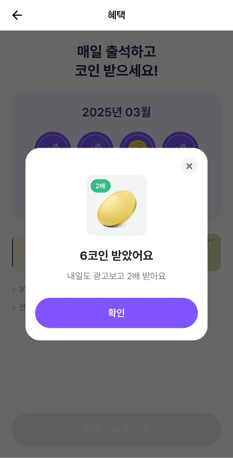 🚀매일 출석체크만 해도 코인을 주는데요. 오늘 저는 출석 더블 이벤트로 6 코인을 받았습니다!