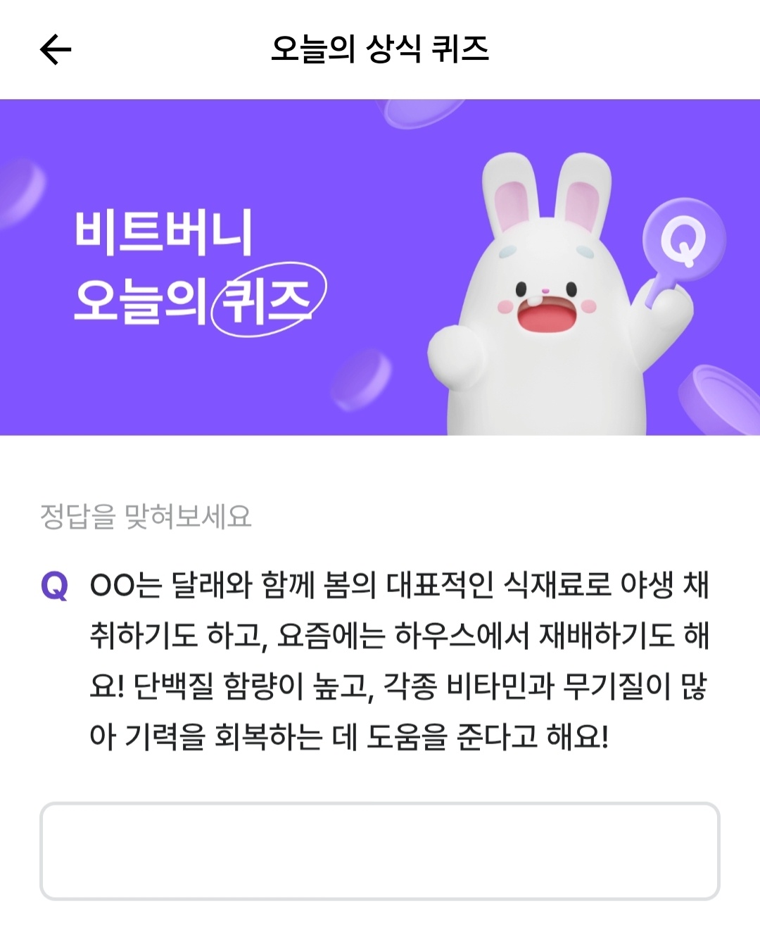 비트버니 퀴즈를 일어나셔서 매일 하나씩 풀어보시고 지식도 얻어가고 코인도 얻어 가보세요!!🤩