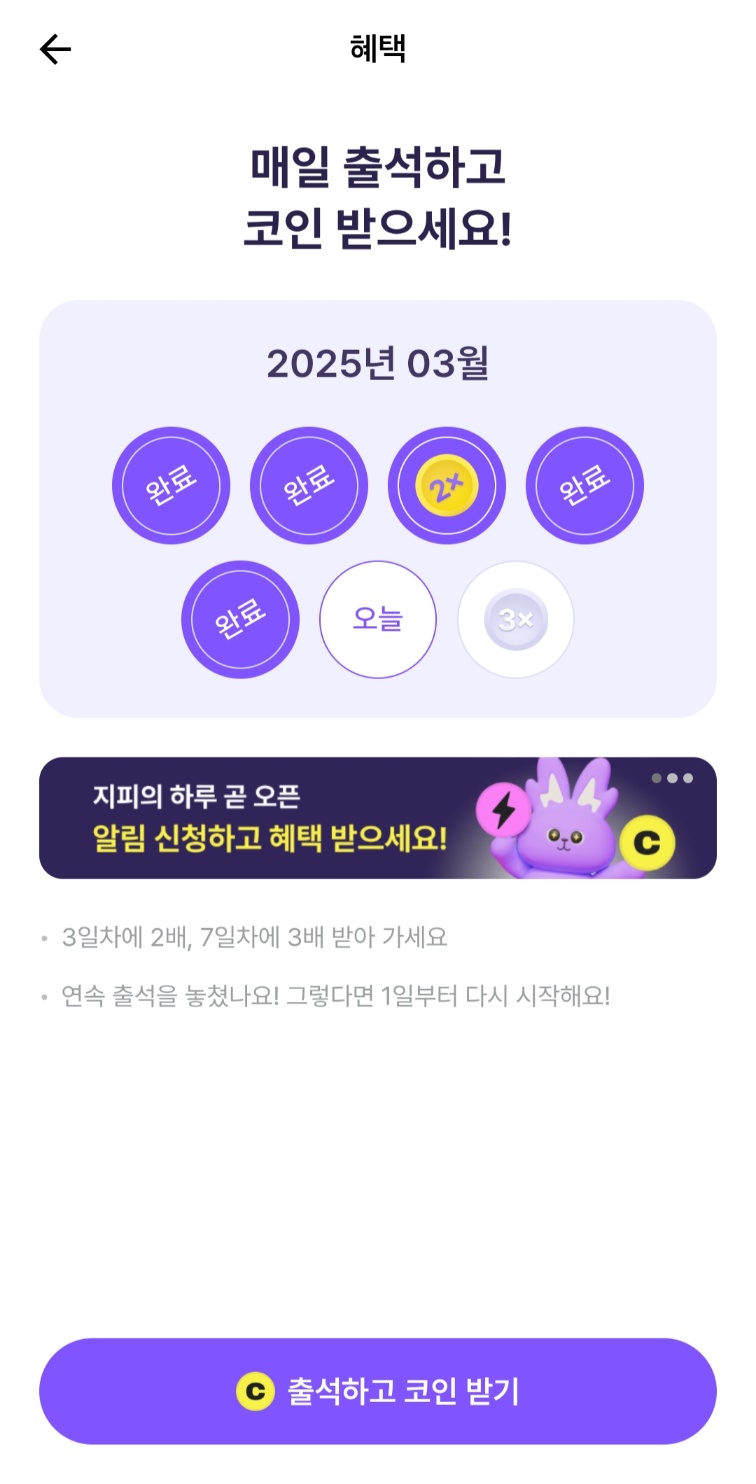 🚀매일 출석체크만 해도 코인을 주는데요. 오늘 저는 출석 더블 이벤트로 6 코인을 받았습니다!