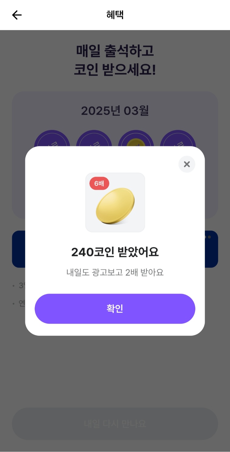 🚀매일 출석체크만 해도 코인을 주는데요. 오늘 저는 출석 더블 이벤트로 240 코인을 받았습니다!