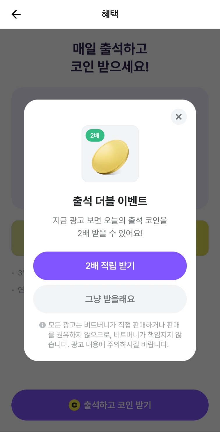 비트버니 퀴즈를 풀고 나면 이렇게 깜짝 코인이 등장을 합니다. 광고를 보고 나면 랜덤으로 보상이 주어지는 구조입니다!