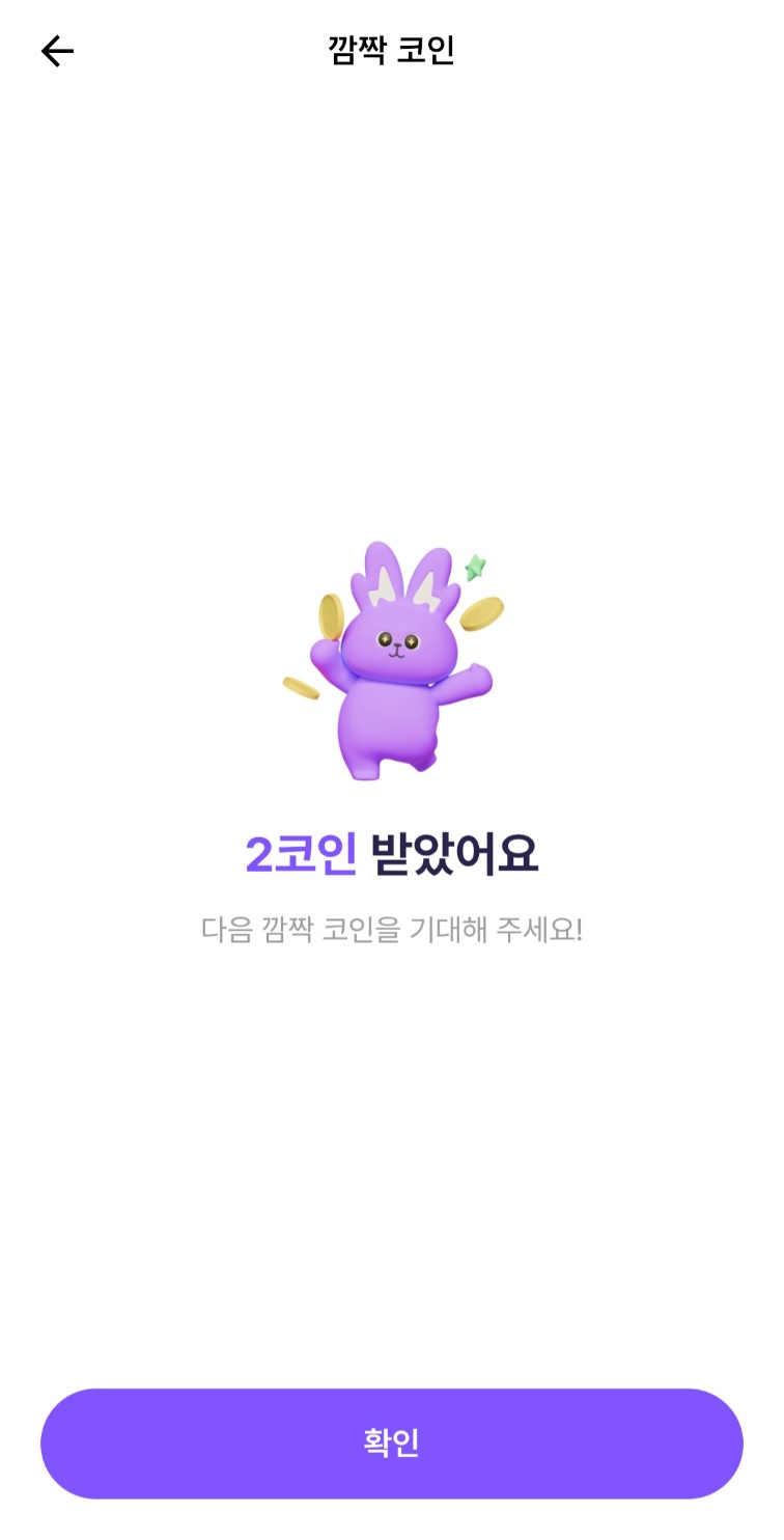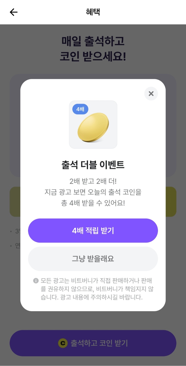 비트버니 퀴즈를 풀고 나면 이렇게 깜짝 코인이 등장을 합니다. 광고를 보고 나면 랜덤으로 보상이 주어지는 구조입니다!