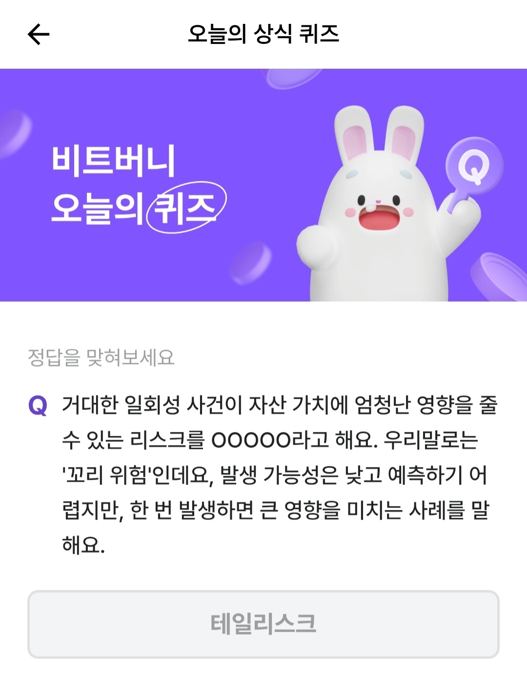 거대한 일회성 사건이 자산 가치에 엄청난 영향을 줄 수 있는 리스크를 OOOOO라고 해요. 우리말로는 '꼬리 위험'인데요, 발생 가능성은 낮고 예측하기 어렵지만, 한 번 발생하면 큰 영향을 미치는 사례를 말해요.