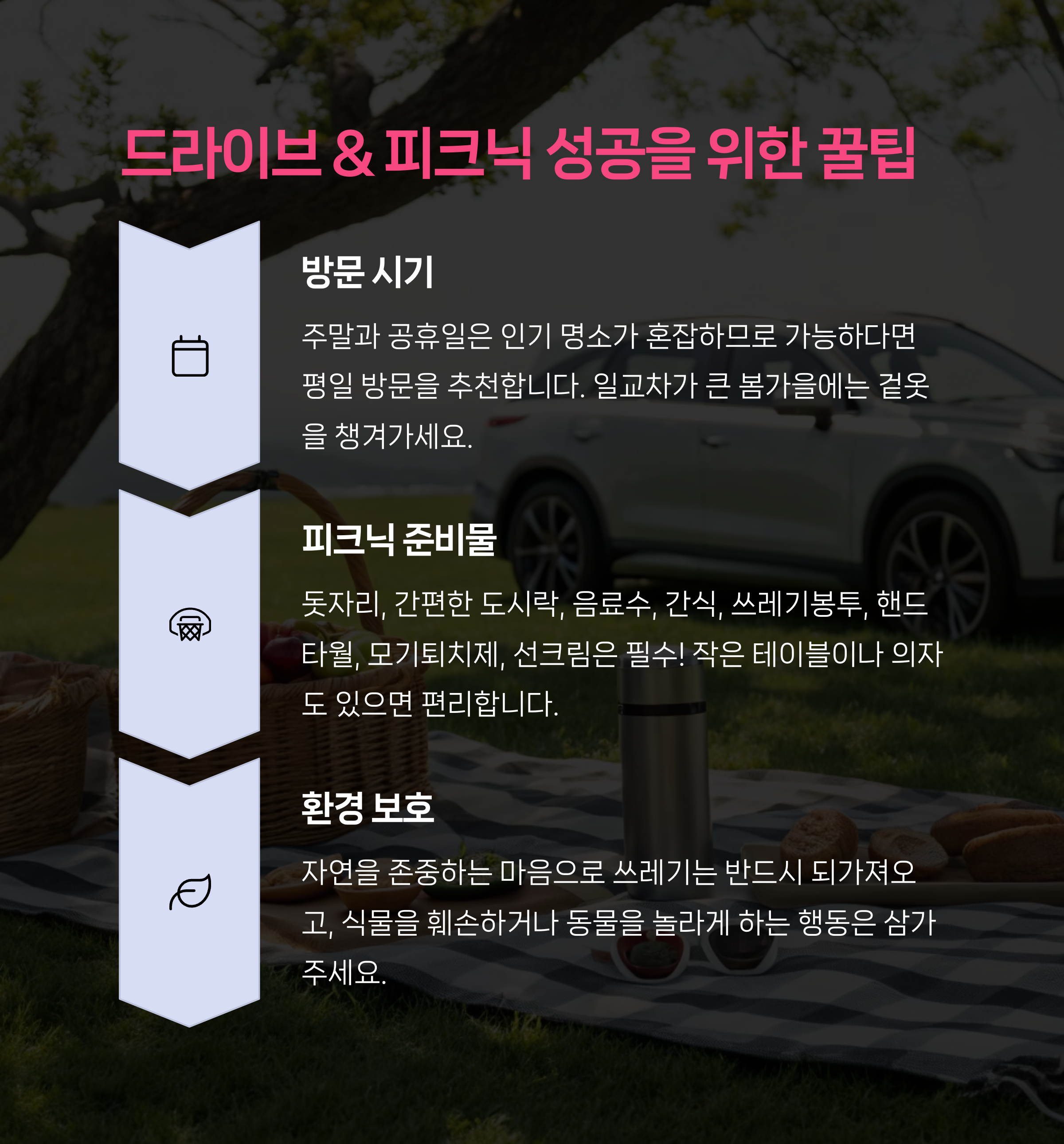 이번 포스팅에서는 드라이브와 피크닉을 함께 즐길 수 있는 장소들을 감성적으로 소개해드릴게요.🚀